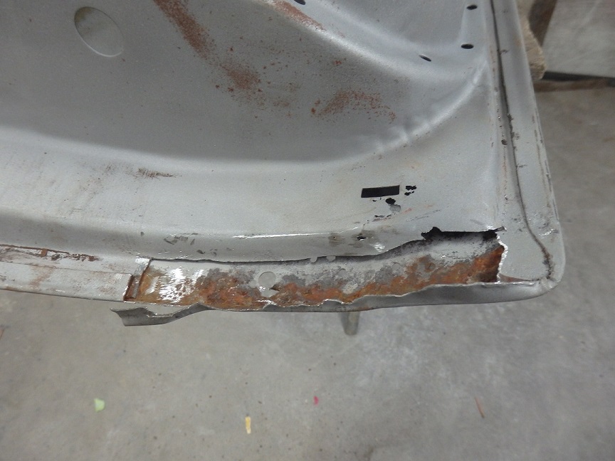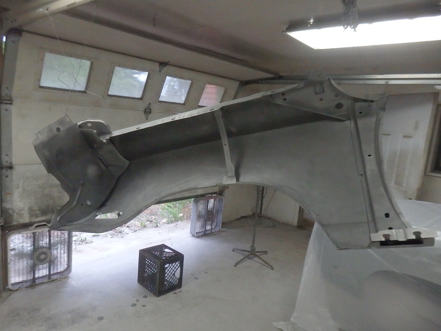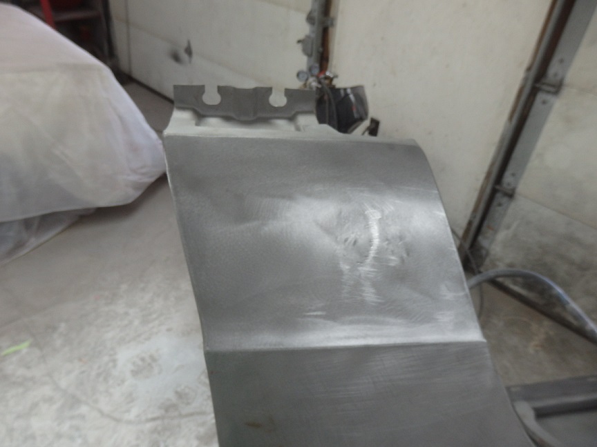 The fenders were actually in pretty great shape after sandblasting. No holes at all. The right fender had a small jamb at the lower rear and a crease at the lower front. As you can see in the picture on the right, the lower section