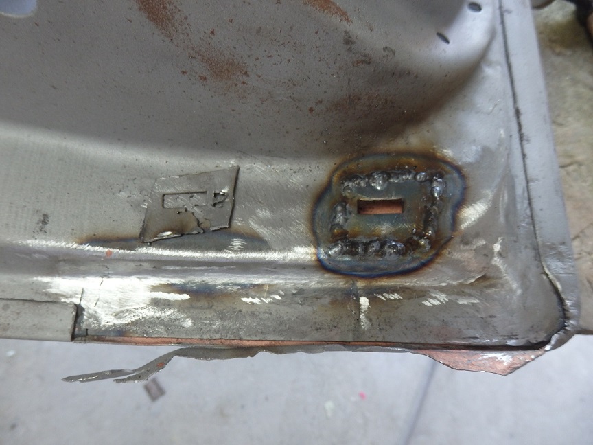 The passenger's door had a small rust hole in the bottom left corner that was revealed by sandblasting. It was quick work to repair the hole. As usual the rust was cut out and a new piece of metal was buttwelded in. I actaully vut a piece off the