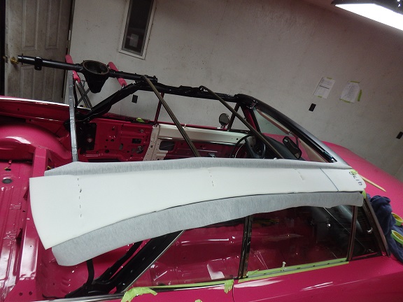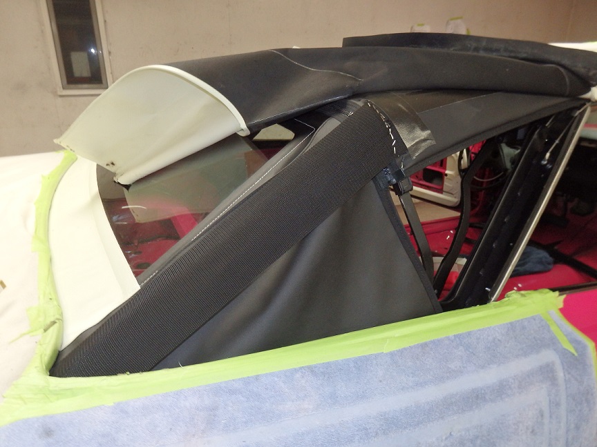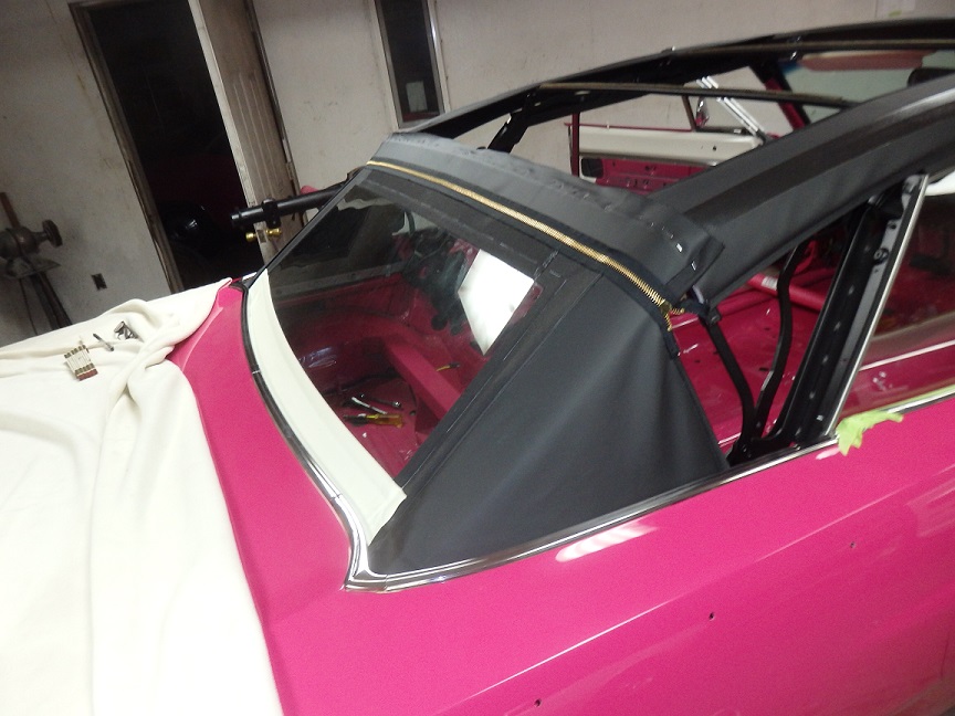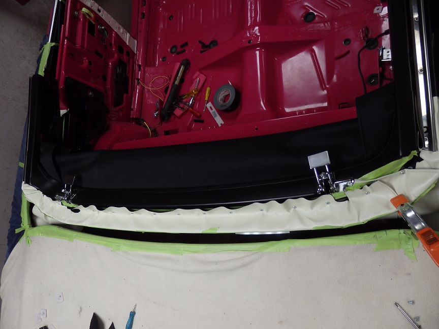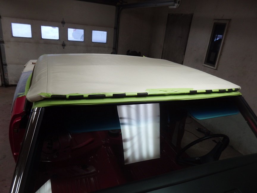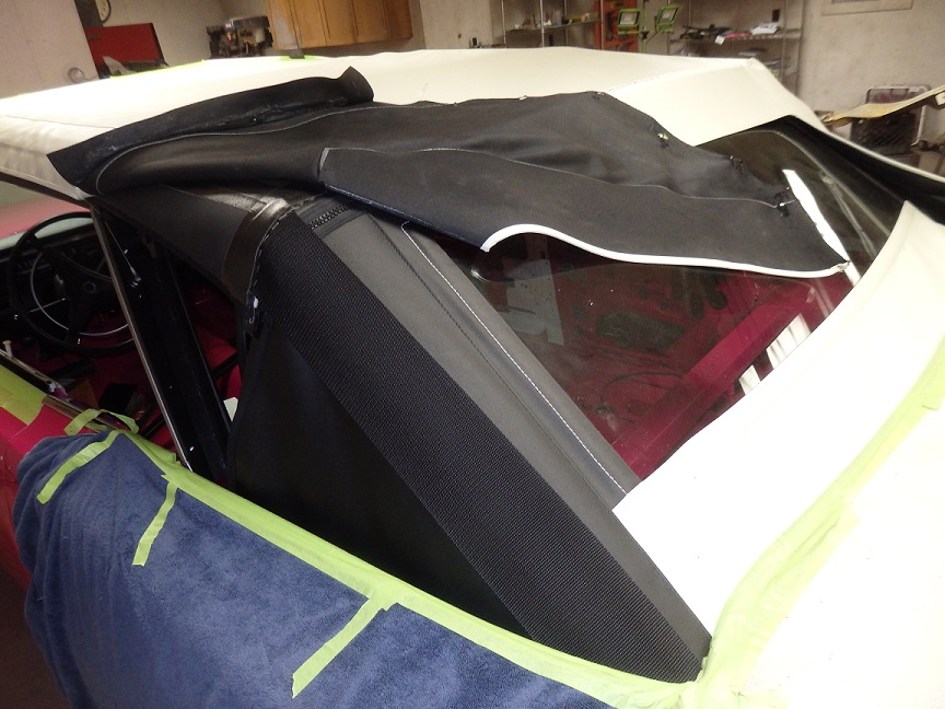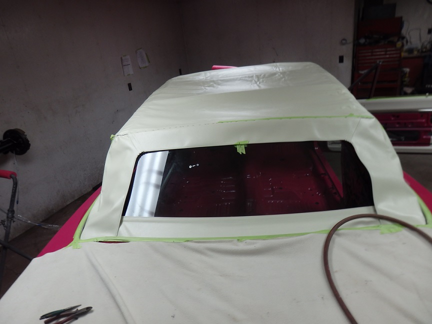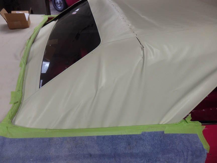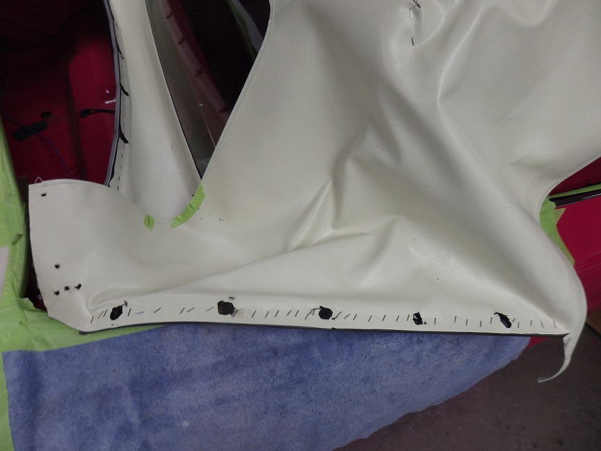 The rear section of the top by the quarter windows was the last to be installed. This took me quite a bit of time. I had to mark it with the tack strip bolted in, then tacked the material to it, then trial fitted it, retacked it, refitted it over and