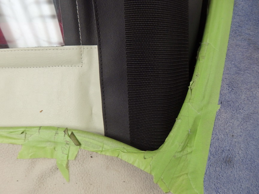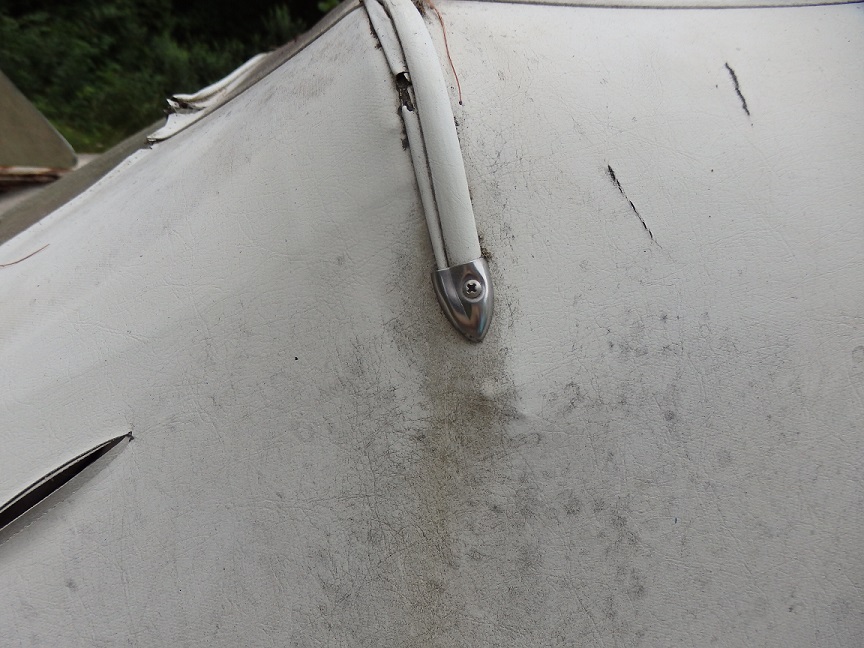 At the rear bow I used masking tape to mark a reference line prior to stapling. This is the area where you need stainless steel staples the most. Otherwise they will rust and the top will come loose from the frame.