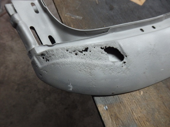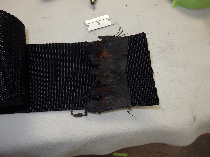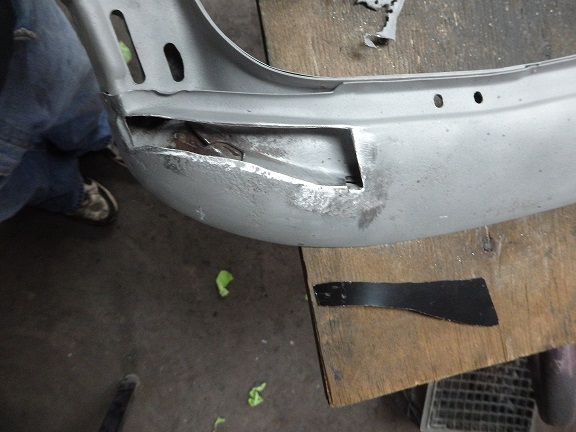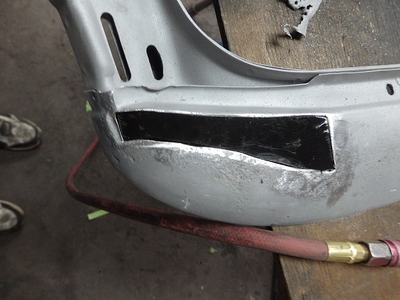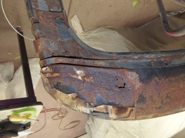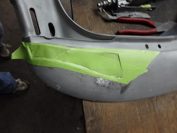 The top frame was actually nice, but a bit stiff. The header bow didn't quite survive intact. It rusted out where the pads were attached on the RH side. This is my typical method for making repairs. I cut out the rust and then I use a piece of masking tape to make template of the