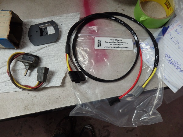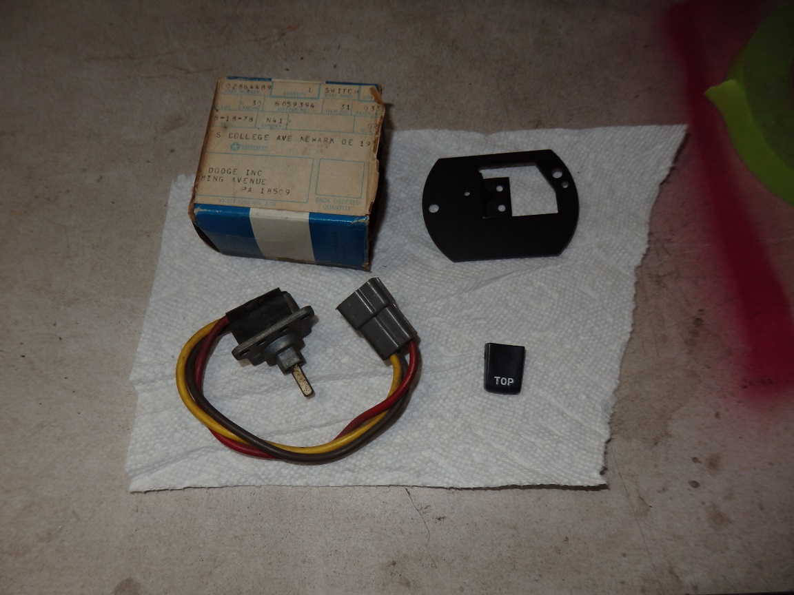 power window. If you flip it over it reads "Top" for the convertible top. I bought this assembly on ebay. I bought an NOS switch from Tony's Moparts. The wiring harness is new repo. A word of warning. The harness for the switch