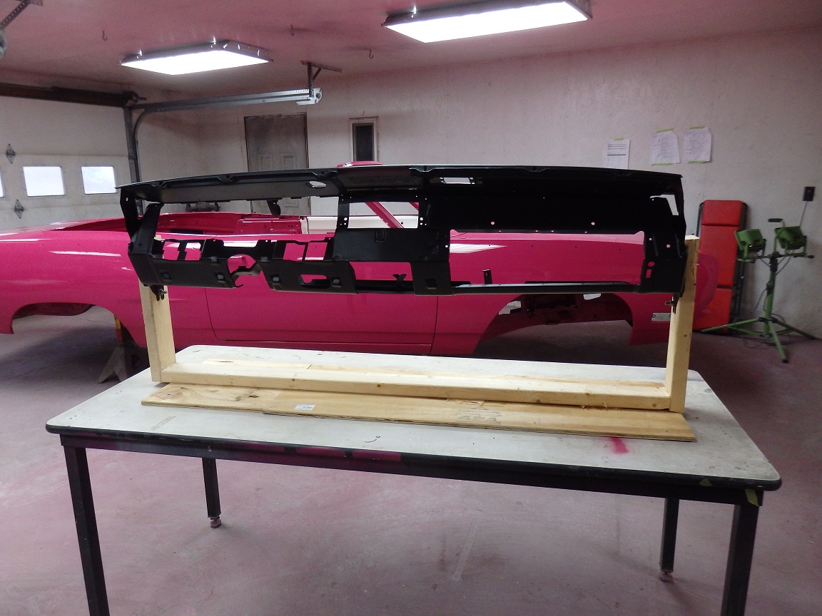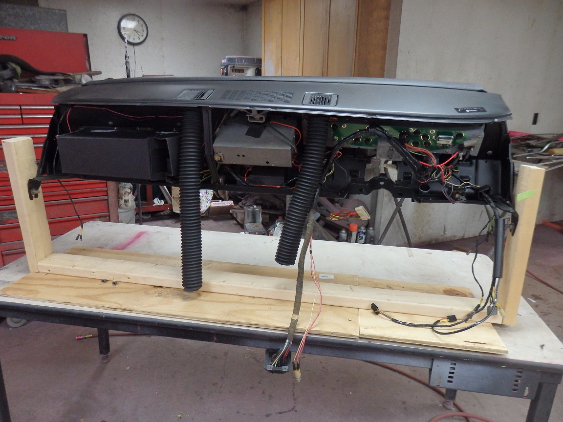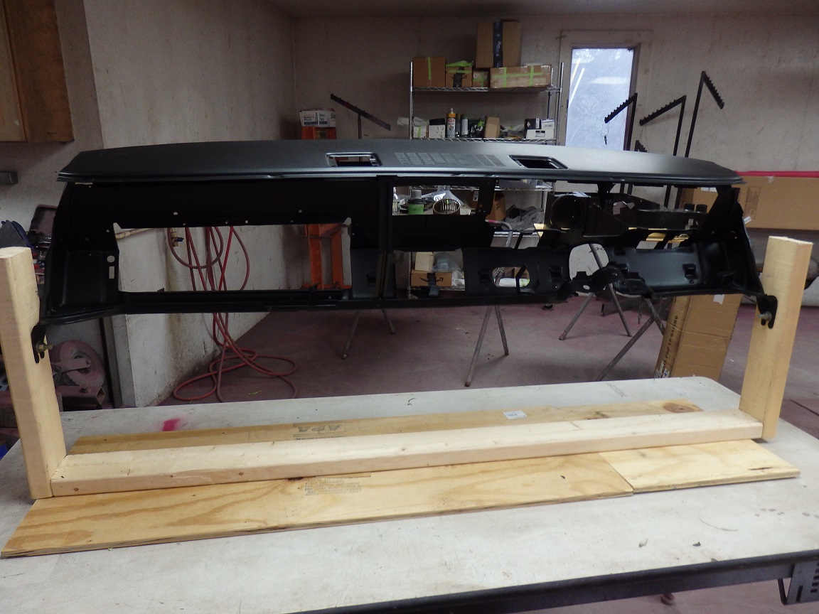 I built an assembly stand for the dash. The dash frame is was only bolted to the stand with 2 bolts with big washes at the bottom where it mounts at the lower A-pillars.