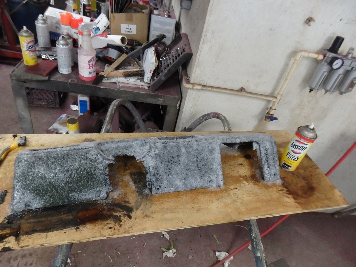 I had the dash sandblasted and then hit it with an orbital sander when I got it back. Minor dents showed up after sanding, which were easily repaired. Once repaired I primed the dash with DP90LF epoexy primer and then painted it