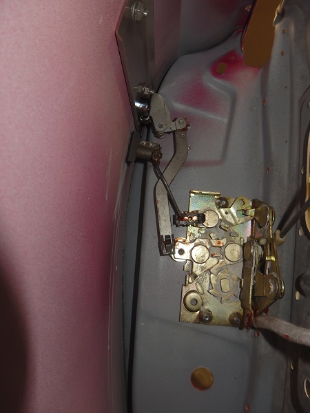 Here the door latches and handles are installed. The door handle reinforcement can be seen at the top of the picture.The latch I lubricated with sprat lithium grease. Everything else I lubricated with a red general purpose grease.