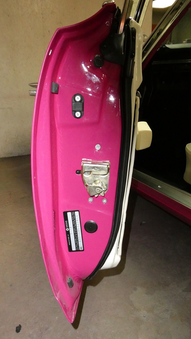 The metal plate at the bottom of the right picture is not original and it was never put on these cars. There is a weak point on the doors where the studs go in at the push button, which can cause the door to crack if you pry on them too hard.