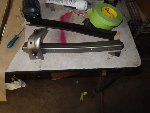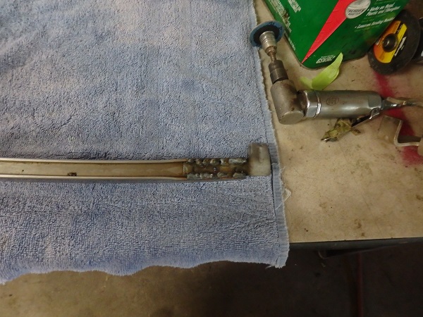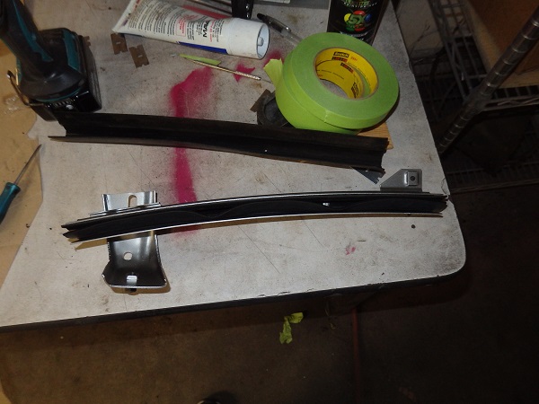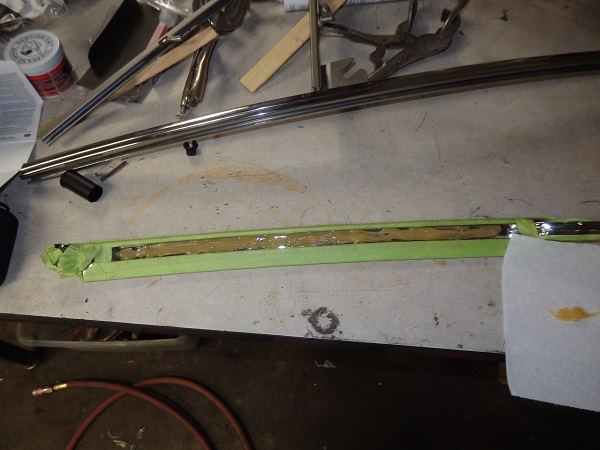 Since the L-shaped piece could not be attached the way the factory did it, as I had ground off the mushroomed pins, they had to be epoxied to the chrome pieces. Seen here, the channel was filled with SEMS panel bond
