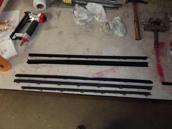 In the third picture is an original window guide strip and a repo (black). Though the repos are nice, I had to punch some holes into them with a paper punch, for the plastic guides. I also notched them at the top. The notch