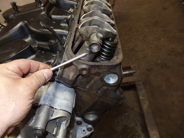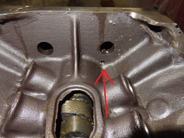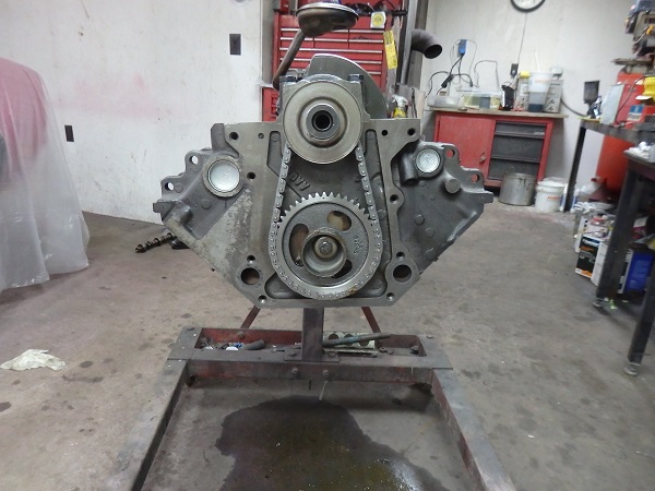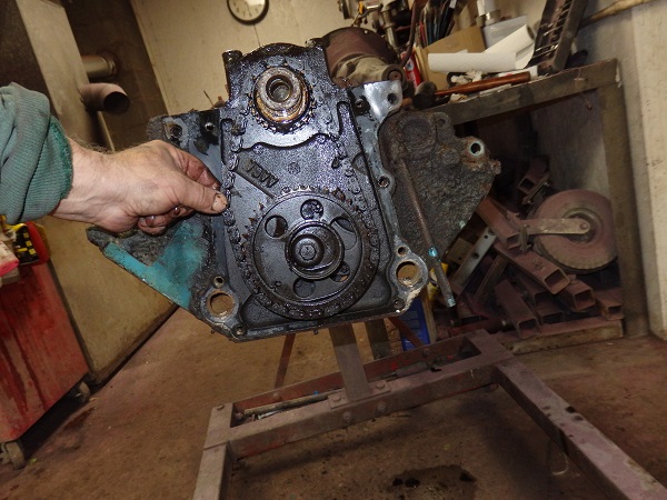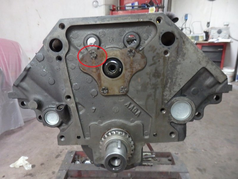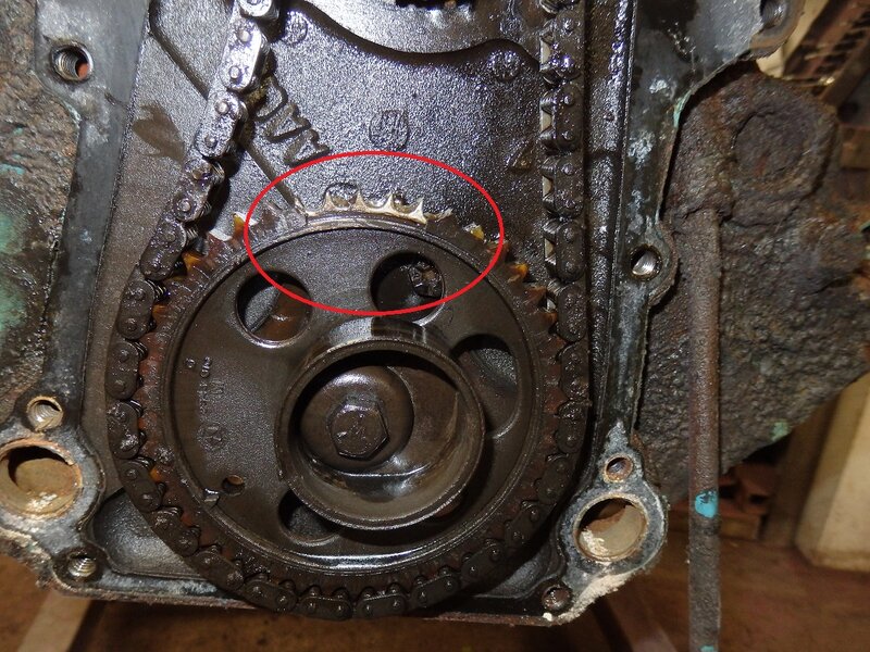I didn't realize this until I started to put the timing chain in: Early 318's, like this one, originally had a special bolt with a hole in it where oil from the oil valley would drip down onto the timing chain. This engine didn't have the
