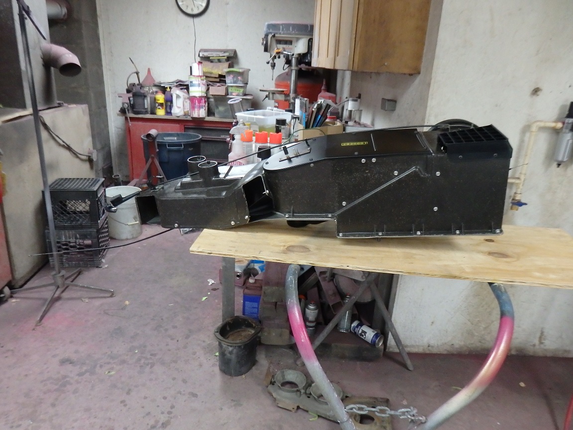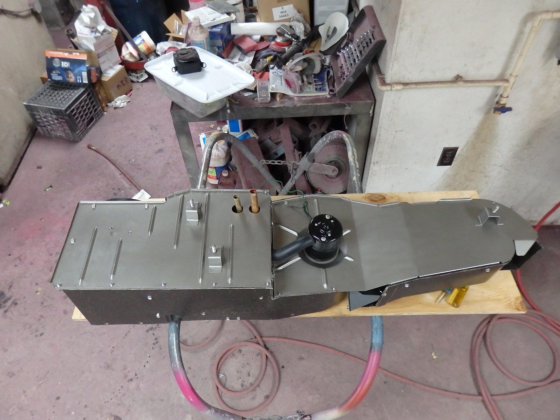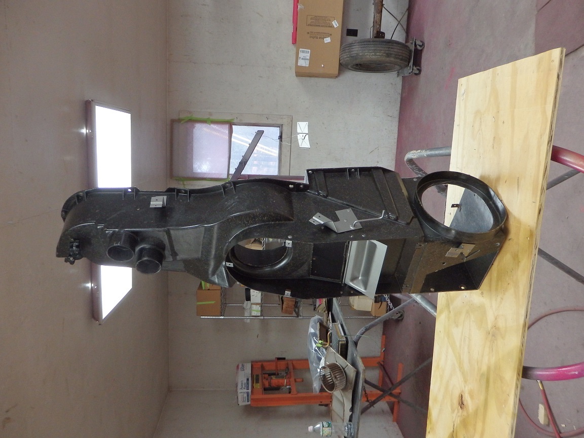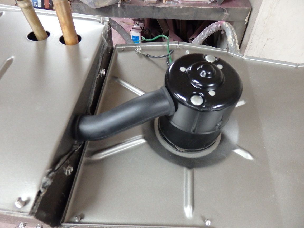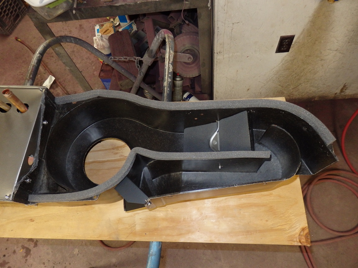 The housing of the heater box is bare fiberglass. All I had to do was scrub it with soapy water to make it look new. The metal pieces that are rivetted to it are supposed to be natural steel. I restored it by sealing the
