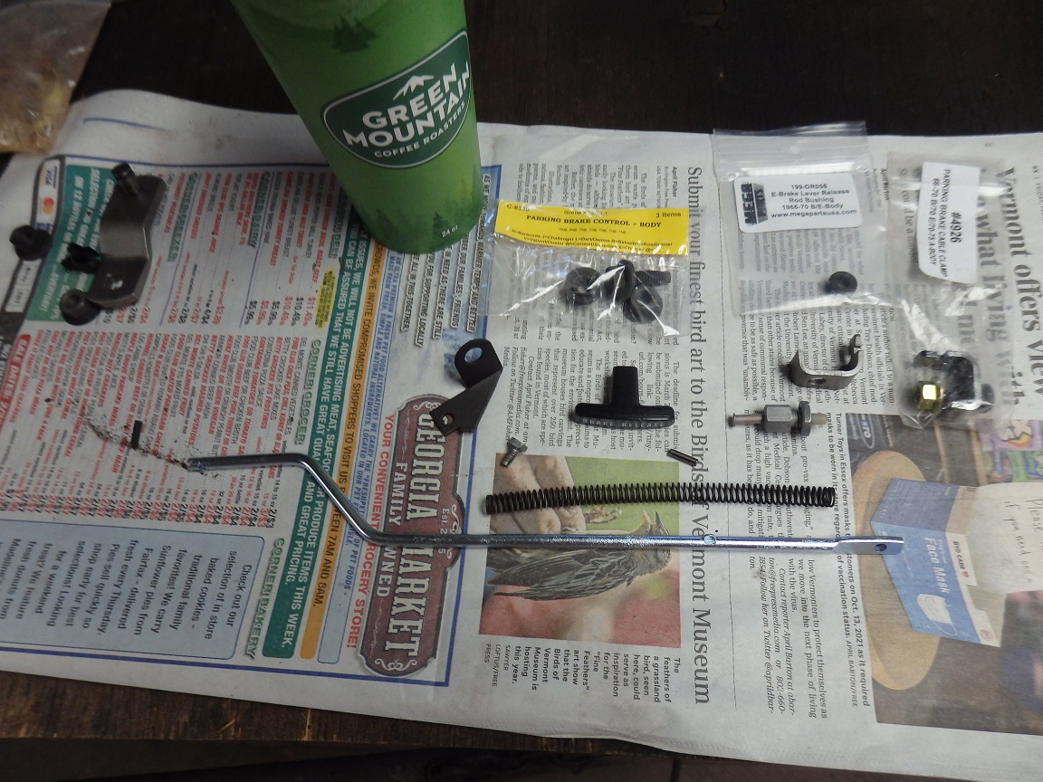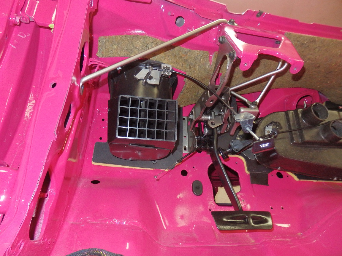 Usually you want to install the parking brake assembly before the LH air vent, but as you can see the original one was a rusted mess. So I ended up finding a used one and restoring that one. I had sent out the handle rod