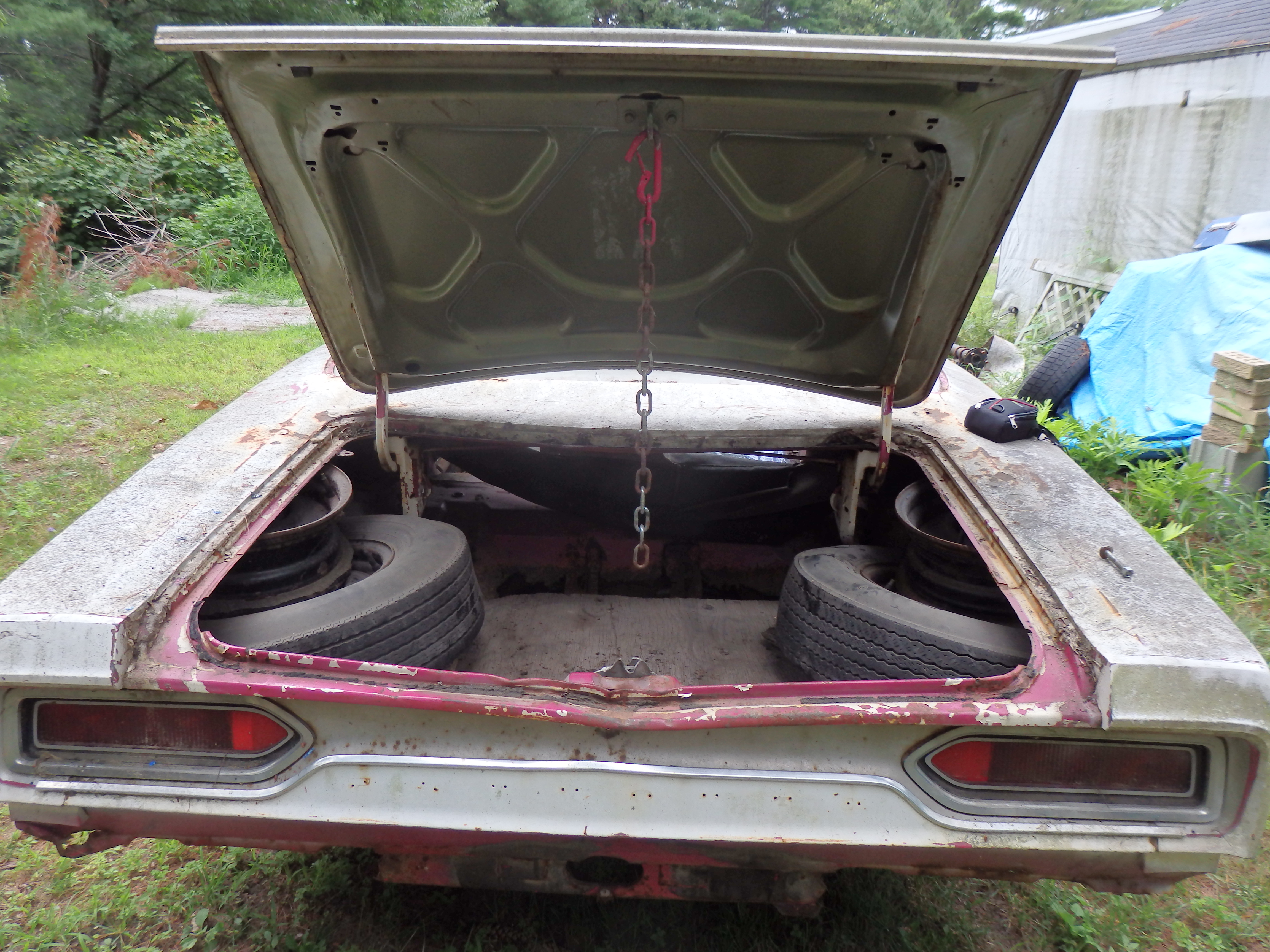 This is one of the main reasons why this car should have been crushed. There was no trunk floor left at all. Virtually none of the rear frame rails were left either. In order for the car to be rolled around someone made a trunk