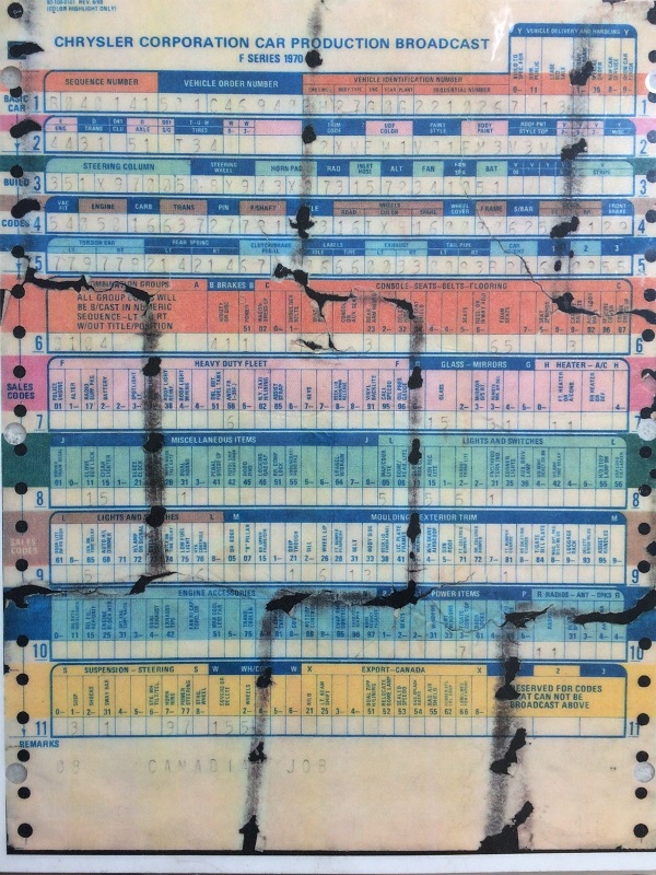 All that I got with mine was a laminated color photocopy of the one from behind the rear seat. That means someone is holding on to my originals. As major components/subassemblies of a car (e.g. dash, seats, engine, etc..) were built, a broadcast sheet was printed and was used to instruct the factory worker as what to assemble. Often the broadcast sheet accompanied the component to the final assembly line so that the correct assembly would be installed on the intended car. All of the printed broadcast sheets for a given car would be 100% identical except for the last 4 digits on line 5, which represent the time of day that it was printed. Each broadcast sheet would receive different markings on them during the assembly process. What is interesting about this one was that it had "CANADIAN JOB" typed in the comment section. To decode your build sheet you either need to pay someone or you can get your hands on a restoration manual from the International Chrysler Collector Authority website. It will cost you a lot, but it is well worth the purchase when restoring a Mopar of value. I am not exadurating in the slightest. I wish that all resto manuals were like this. Hint, hint Jeff Speegle..... | ||