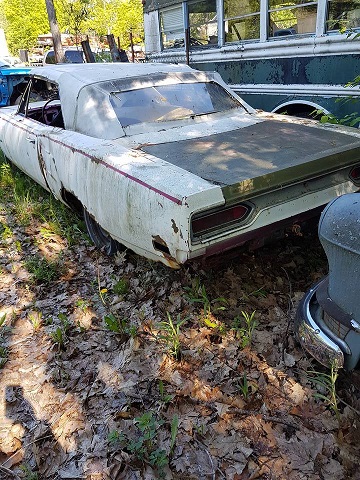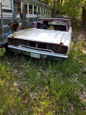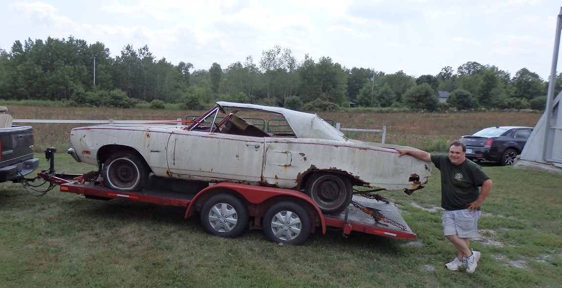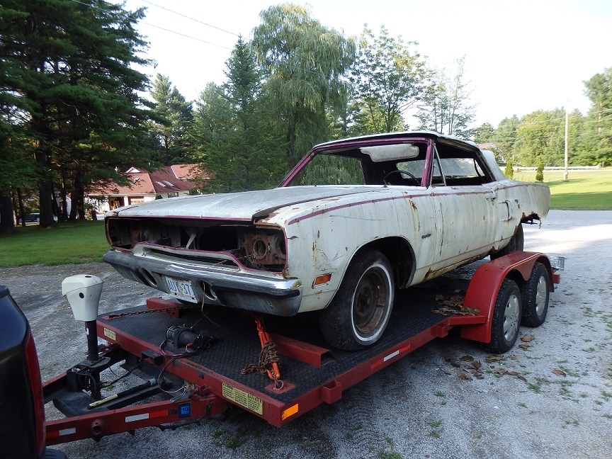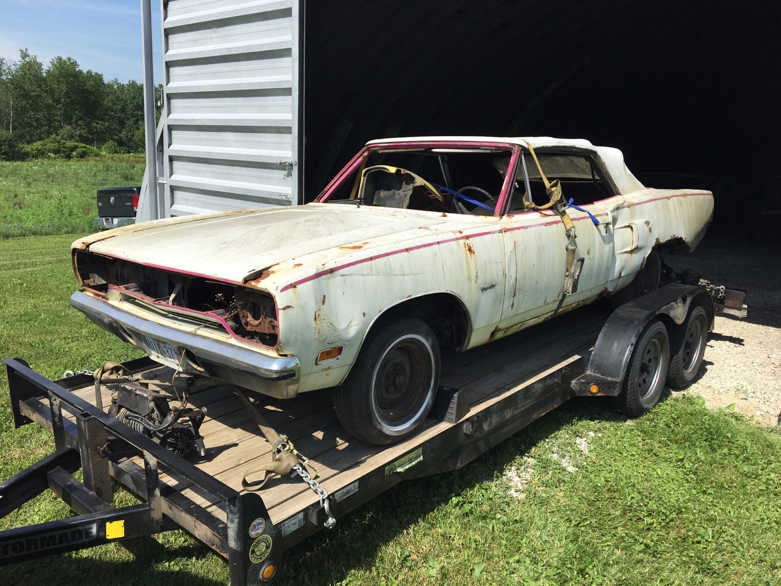 hands several times after that and ended up at Jamie's Garage (Hamilton's Restoration's) in Havelock, Ontario where it awaited restoration for a couple of years. The rest of its history I was eventually able to piece together from the paperwork that came with it and what Jamie told me. I did some searches on the mopar webforums and found an old posting by Nigel about the car, which was deleted before I got the car. At the time Nigel found it, the frame rails were pretty bad and needing replacing. He imagined that they would be far worse after 20+ years since he saw the car. Boy was he ever right about that one. I did a little more research and learned that only 701 Satellite Convertibles were ever built. Out of the 701 only 109 of these cars were exported to Canada. There were only 2 US built cars painted FM3, Moulin Rouge. The car was also built as a Canadian Dealer Demo car. So pretty much this was most likely a 1 of 1 car. So this car was very rare, very rusty and I had the exclusive purchase rights to it. So..... I was in ! All I had to do was drive to Ohsweken, Ontario (south west of Toronto) and import it into the US. 910 miles round trip. | ||