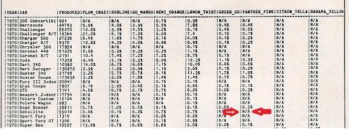 report. Here are the illedged actual percentages of High-Impact Colors produced for the 1970 model year (for the US only), from a magazine article by Galen Govier. You can see that N/A is listed for Satellites in Panther Pink (aka Moulin Rouge). This was probably based on any earlier SG-30 report as there are known Satellites in FM3. ![]() So how can I say that there were only 2 1970 Satellite Convertibles built in FM3? Well, the best I could do was ask someone with an SG-30 report printed in August of 1970, what the production percentages were for FM3 Satellites. Apparently people with copies of the report are not allowed to distribute pictures of the report. So this is all I could get: