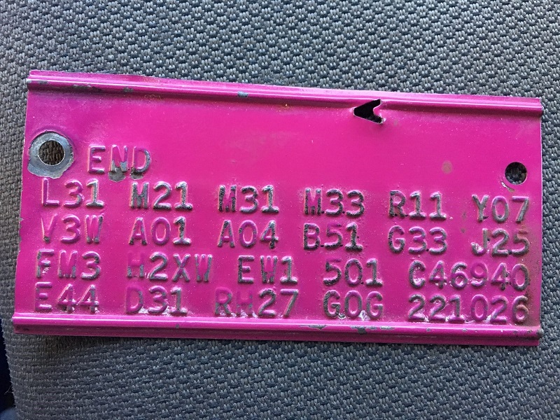The Fender Tag (or Build Tag if you prefer) is screwed to the left inner fender, if not lost or stolen, is also a valuable piece of the car. I would not have bought the car if it did not have the tag. When properly decoded, it lists information about how the car was built and what options it