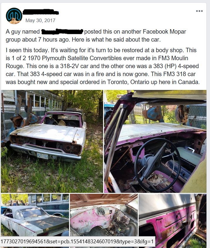I hadn't planned on doing another FM3 (Panther Pink/ Moulin Rouge) Mopar and this one was not listed for sale that I could find and it was too far for me to just go take a look at it. In fact it was in Ontario and I live in Vermont. Without thinking any more about it, a year went by and to my surprise I got an email offering to sell it to me ! The owner had died and his sons were selling off a bunch of his cars as a package deal. The sender of the email, Rick Monture, was trying to buy the cars and didn't want the Satellite. He had found an old Want Ad that I had posted on PantherPink.com a decade prior and he contacted me in hopes that I would buy the car off him, which would help reimburse him on the purchase of the other cars. Since the car was actually in northern Ontario and he was south of Toronto, all he could send me for pictures was the original ones posted on facebook and some additional pictures showing the broadcast sheet and the fender tag. | ||