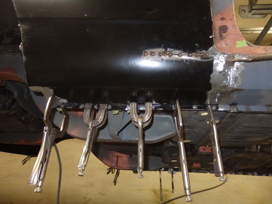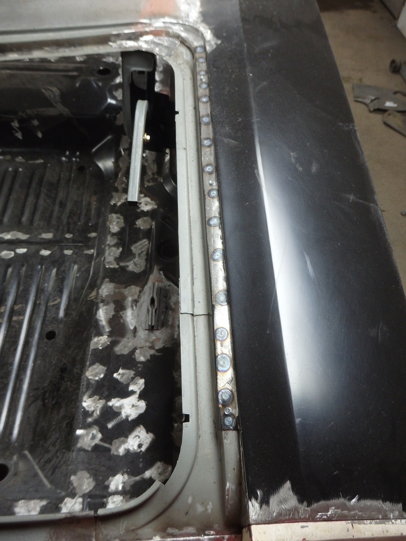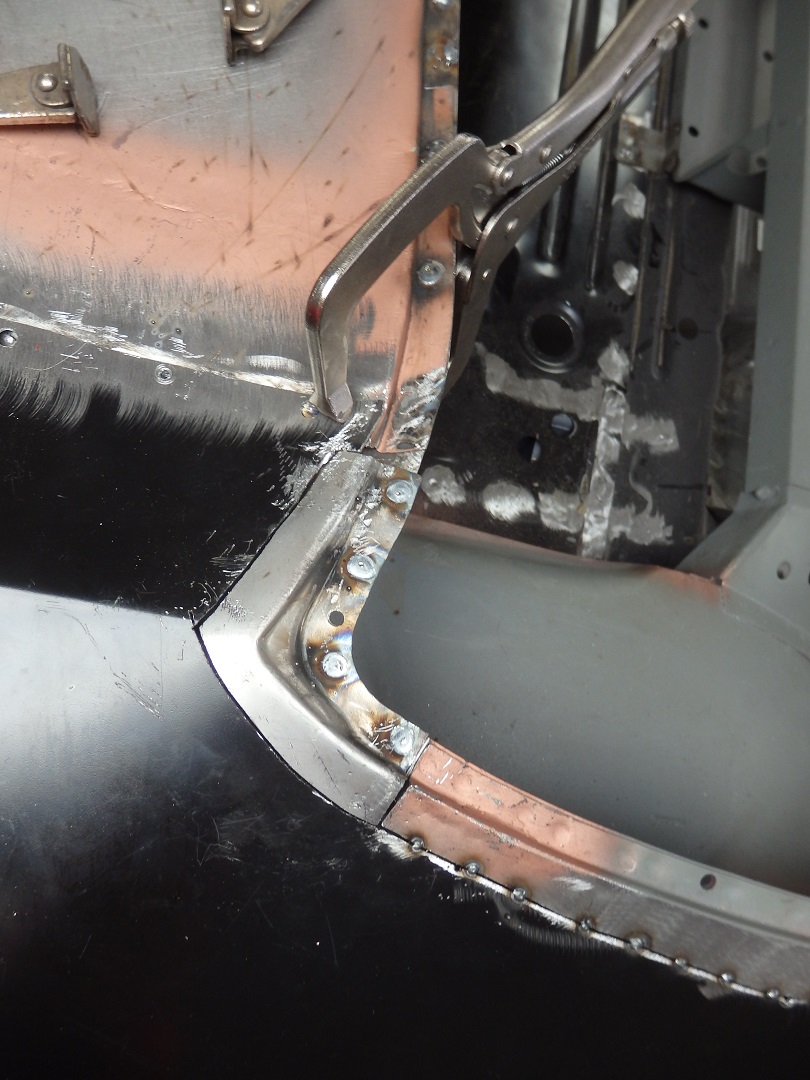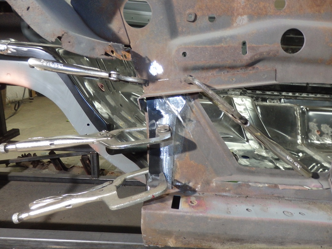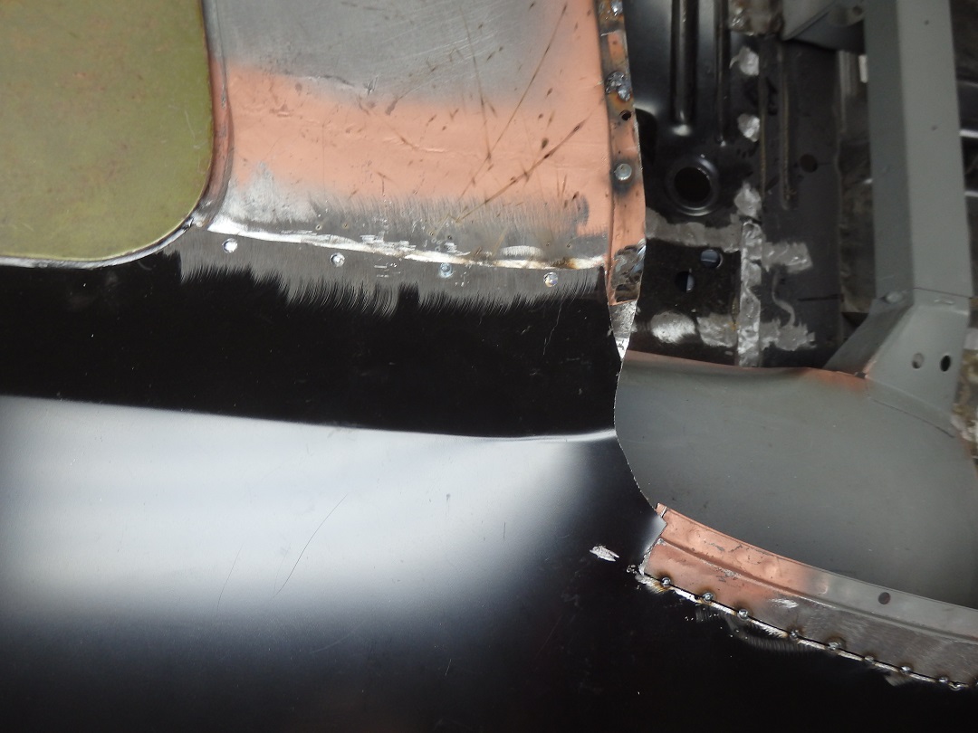 Here the butt welding process had begun. The idea, as shown before on many of my other projects, is to overlay the new panel over the old, cut through both panels, pull the unwanted material away while tackwelding the new