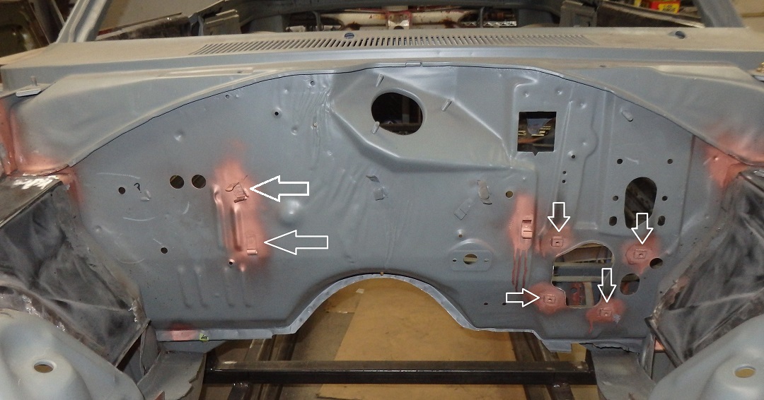 The firewall in the engine bay needed a little work, indicated by the white arrows. I had to make the wire hold-down and brake line hold-down on the passenger side. I had to weld back in thee 4 nuts on the driver's side