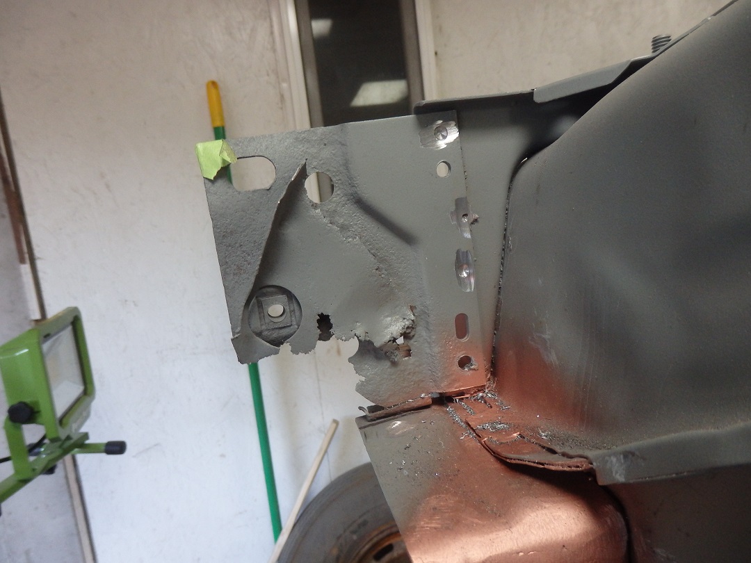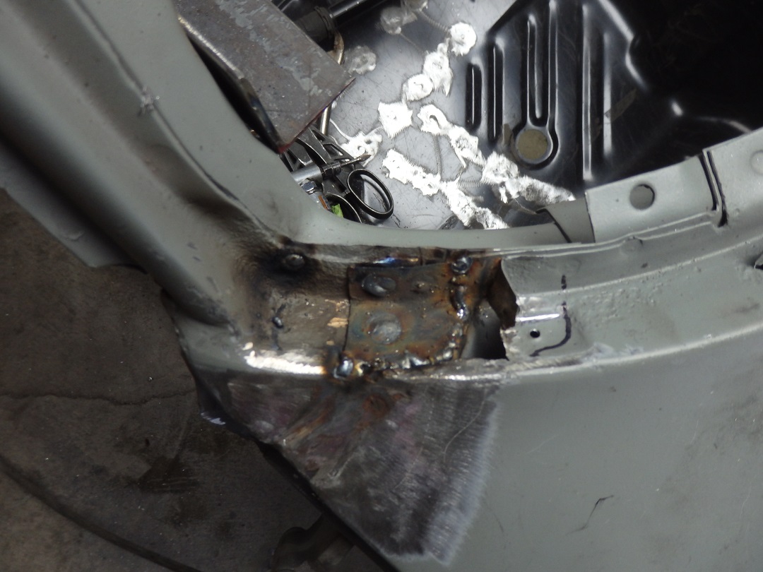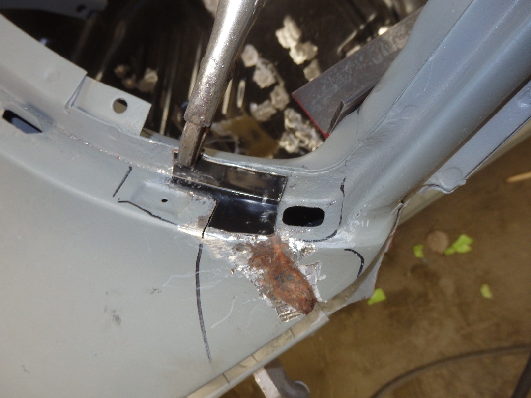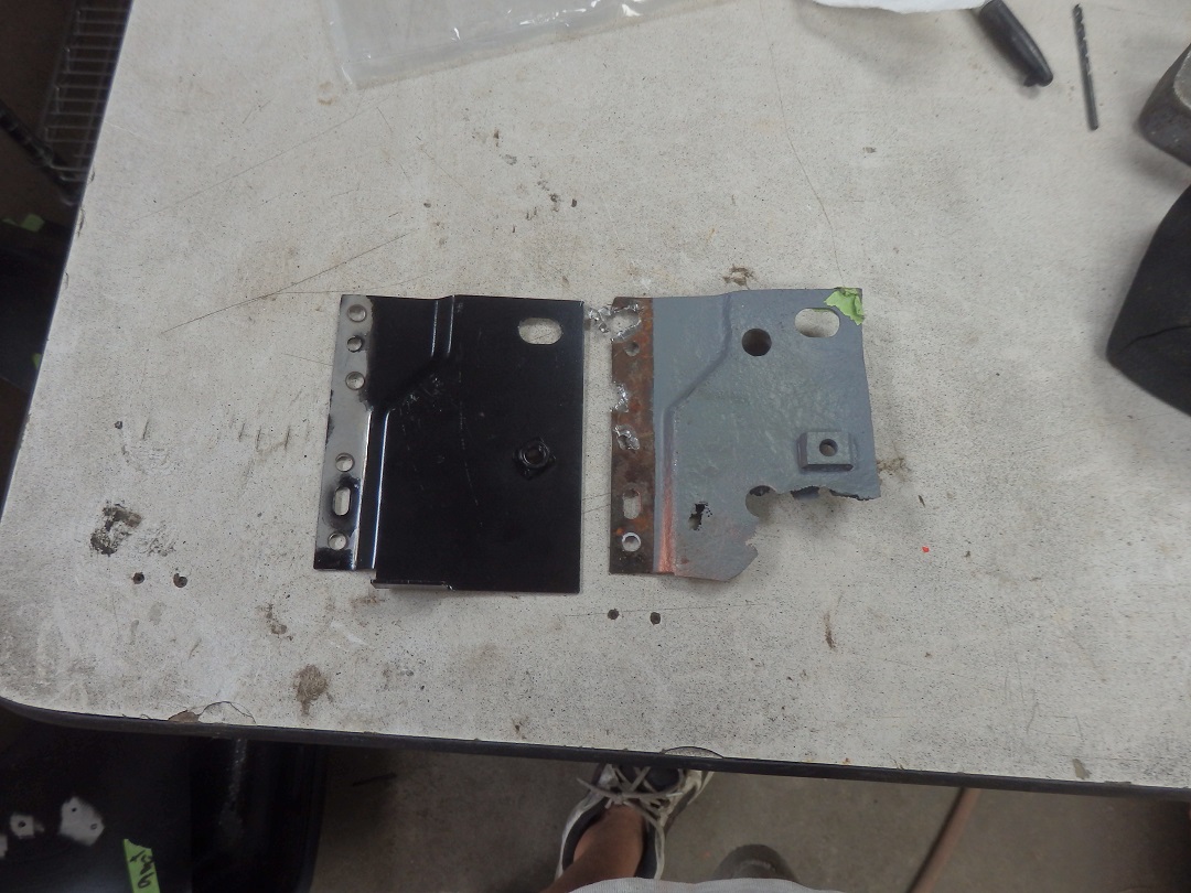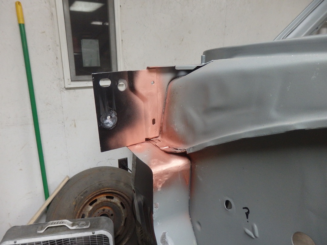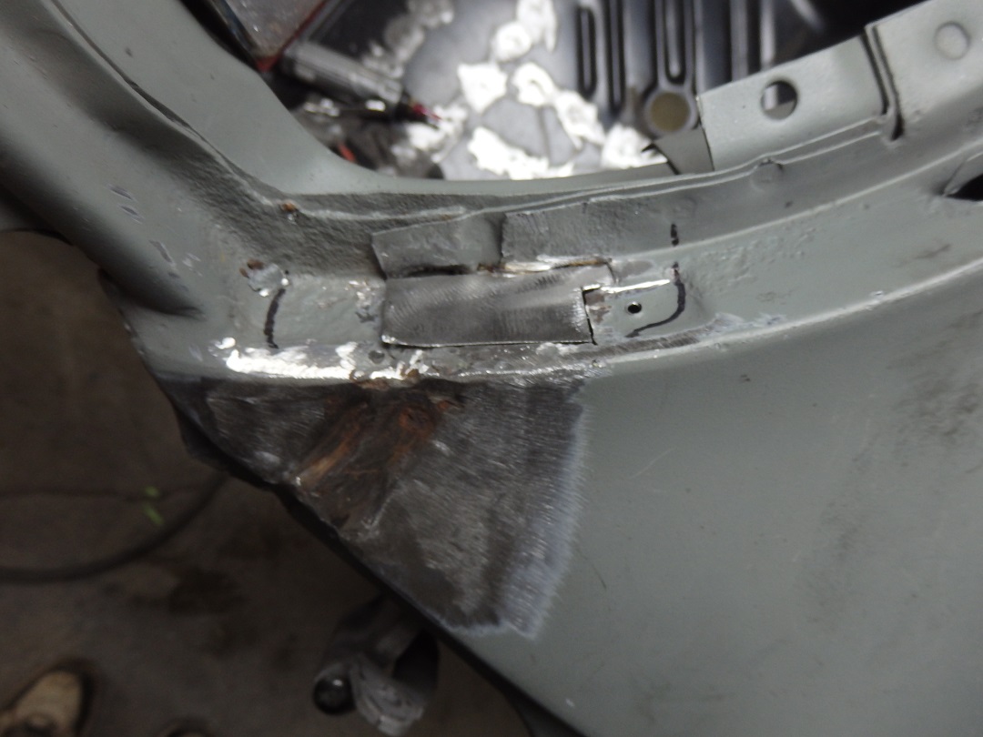The inner fender hood hinge reinforcement needed to be replaced on the right side. The repo part is close to the original. I added the missing hole and move the square nut over from the original one.