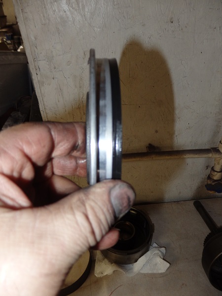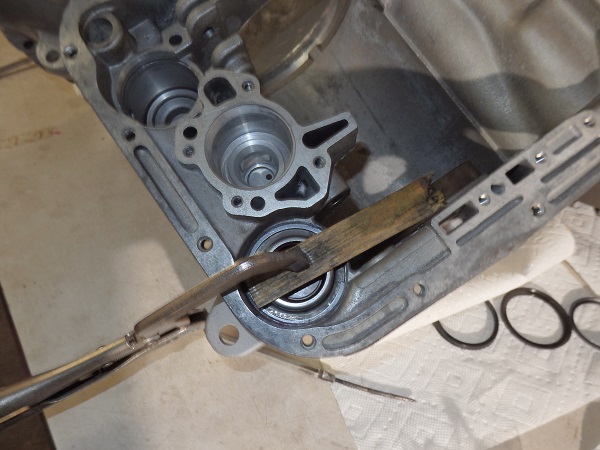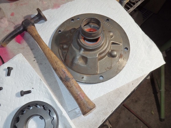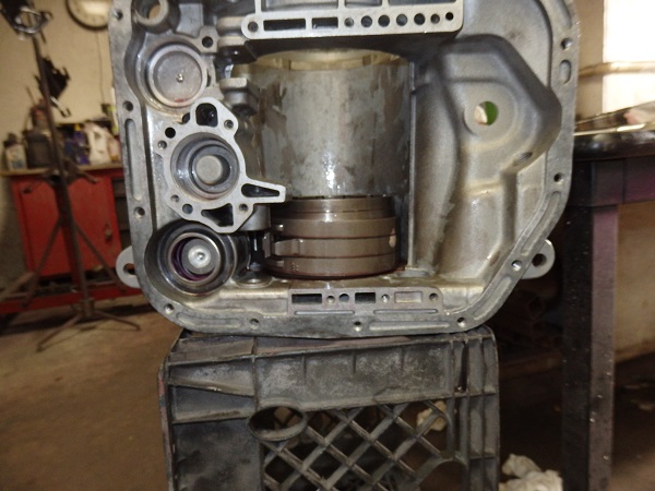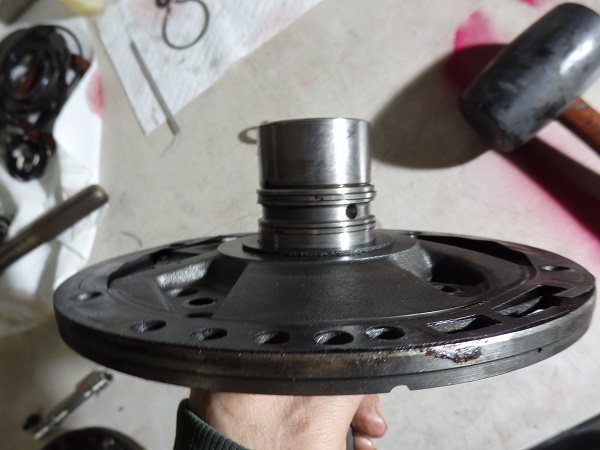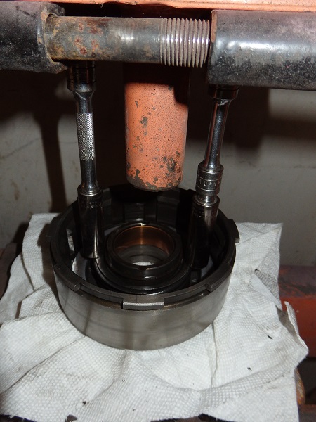 Taking the forward clutch apart for rebuild requires compressing a spring and removing a retaining ring. Again a special tool is required, but I cheated and used a couple sockets and some extensions along with a press