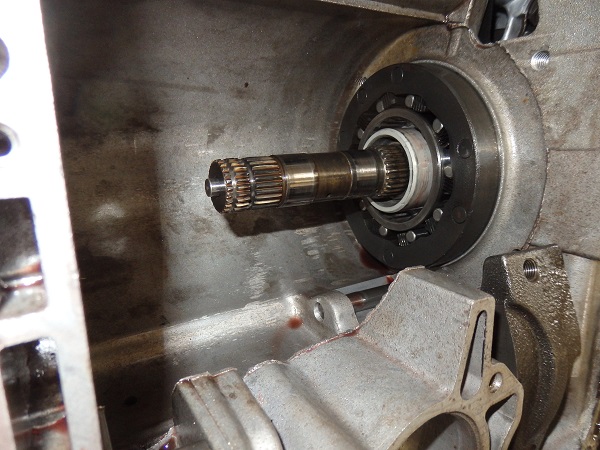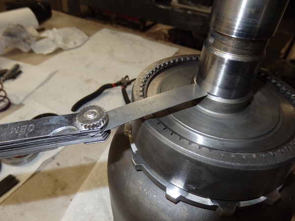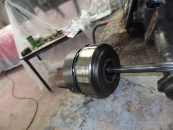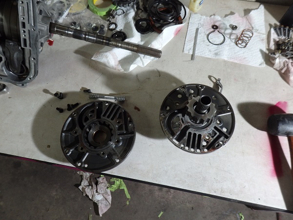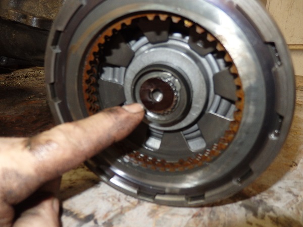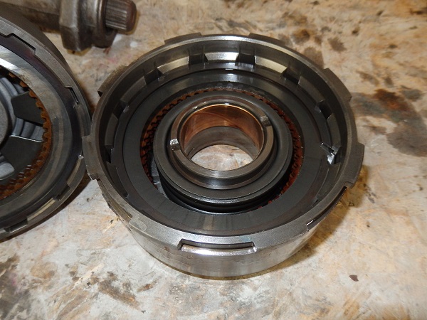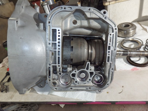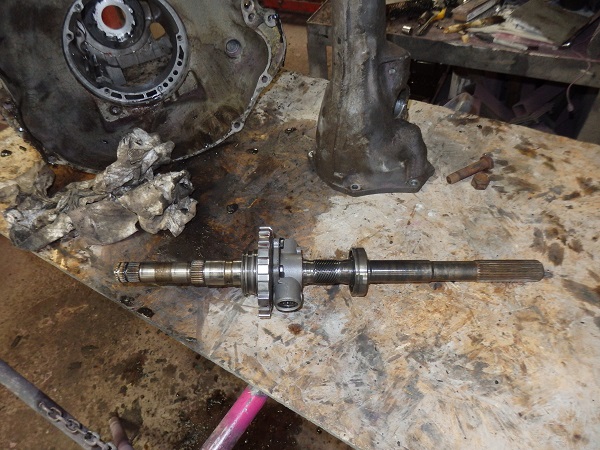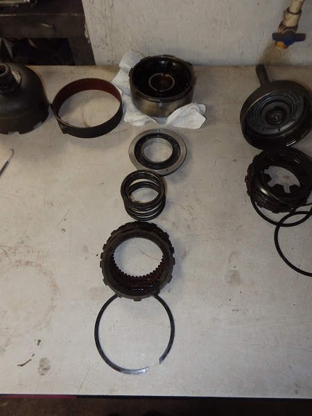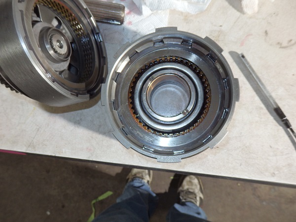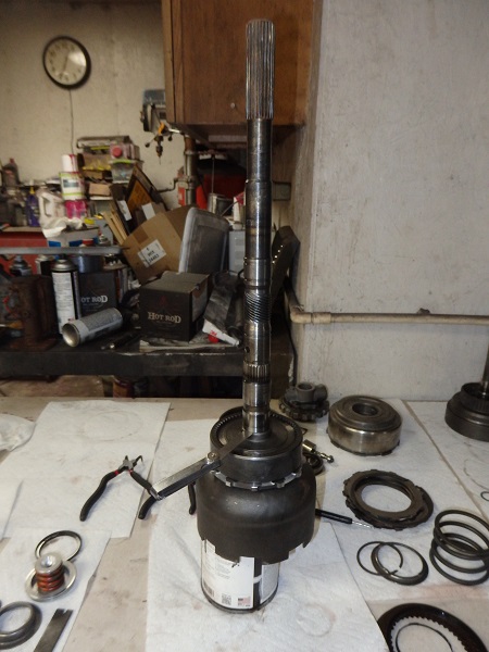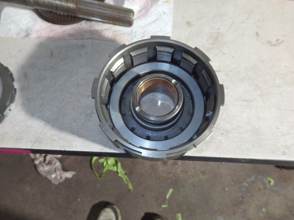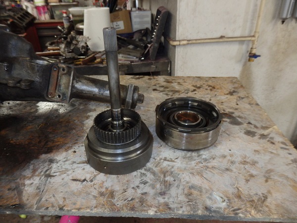 The direct drum, forward drum and input shaft come out together. There is a special washer that butts up between the input shaft and the output shaft. You have to be careful not to lose it when you pull the transmisison apart.