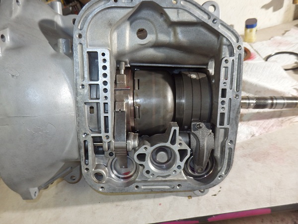 To remove the direct drum you have to relieve tension on the front (kickdown) band. You have to pull the pivot pin (first picture) to remove the lever on the inside