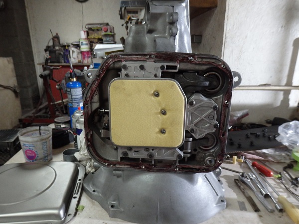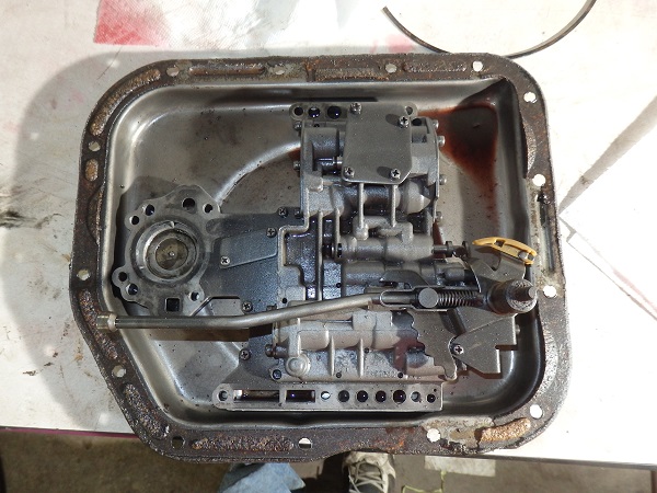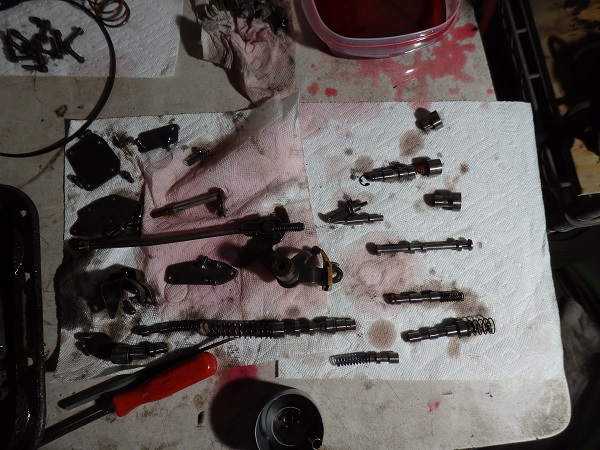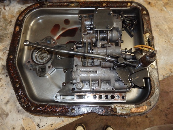 The first thing I did was to pull the trans fluid pan and removed the valve body. You have to be careful not the loose the accumulator spring (orange) and