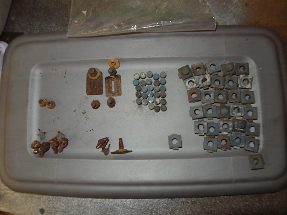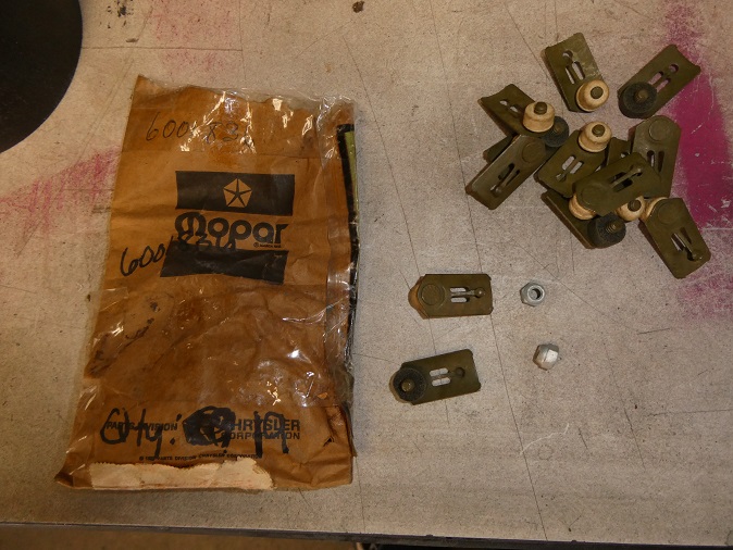 The picture on the left shows all of the side moulding clips that I had. I was able to locate some NOS ones for the ends of the door mouldings. I was also able to locate some repo clips for the ends of the front fender mouldings. I was short a couple of the