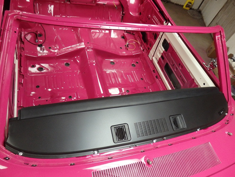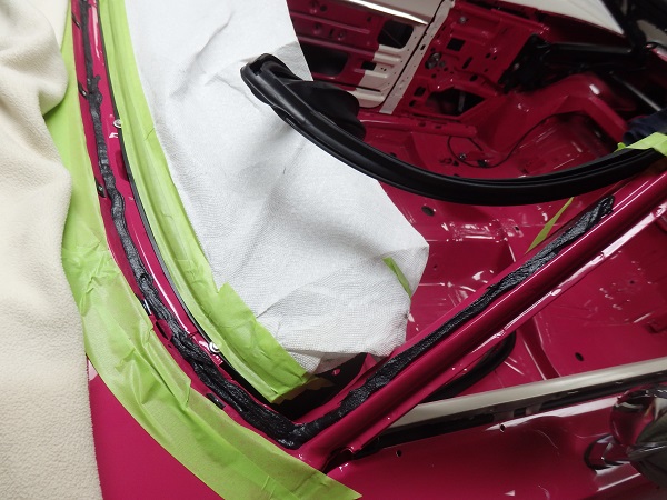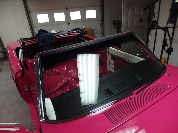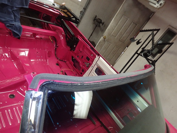 Once the A-pillar mouldings are installed a thick piece of gray foam is installed across the top before the top mouldings go on. Unfortunately I didn't take a lot of pictures. Though I am sure I will be adding them to the swebsite at some point. |