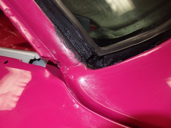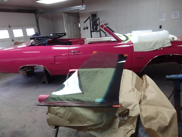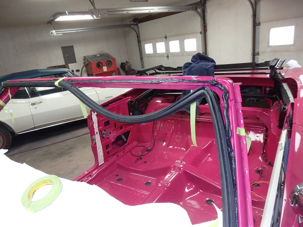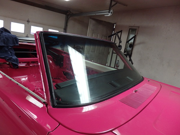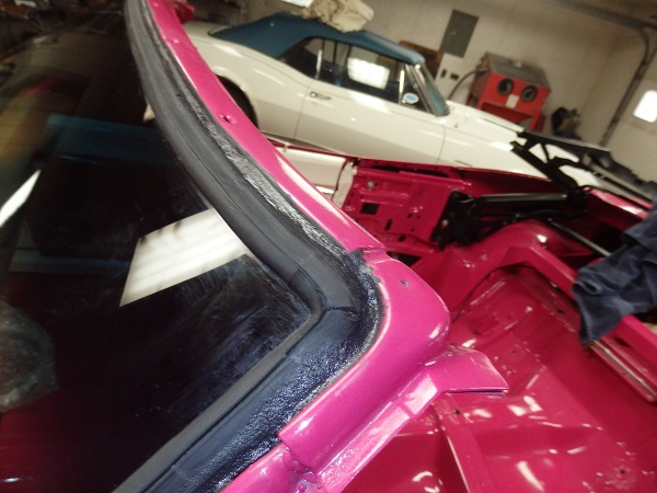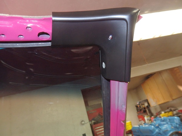 The inside trim needs to be installed before the outer stainless steel mouldings go on. The plastic A-pillar mouldings are unique to convertibles and are very hard to find. Luckily I had both, though one had to be repaired. |