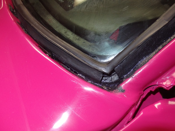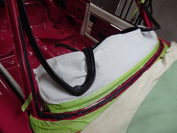 One the windshield is set, it is beat to fill the gap between the weather seal and the opening. |