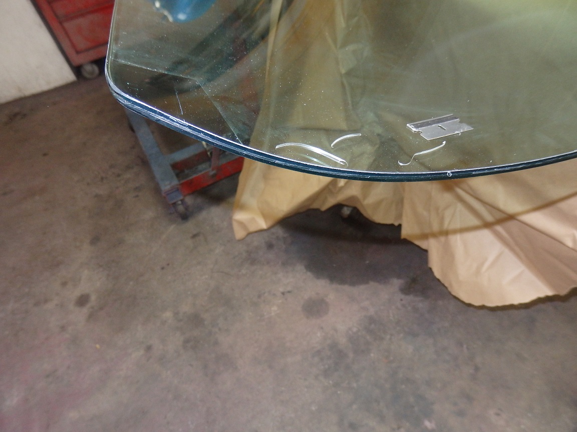 Here is the new windshield I got from ECS Automotive. It was properly date-coded and had the correct logo etched into it. Windshields are made by bonding two layers of glass together. trimming edge of windshield. It is common for the adhesive to stickout beyond the glass. Excess should be trimmed back so that the windshield sits in the weather seal correctly. |