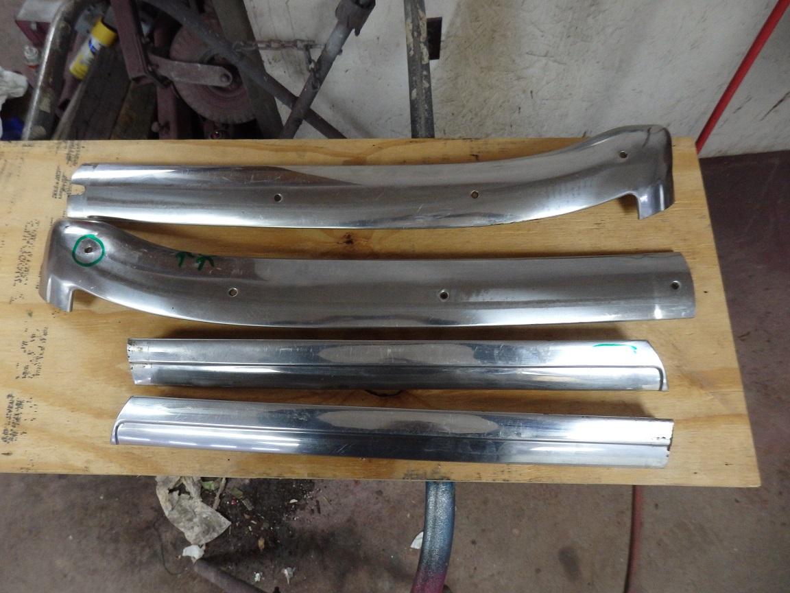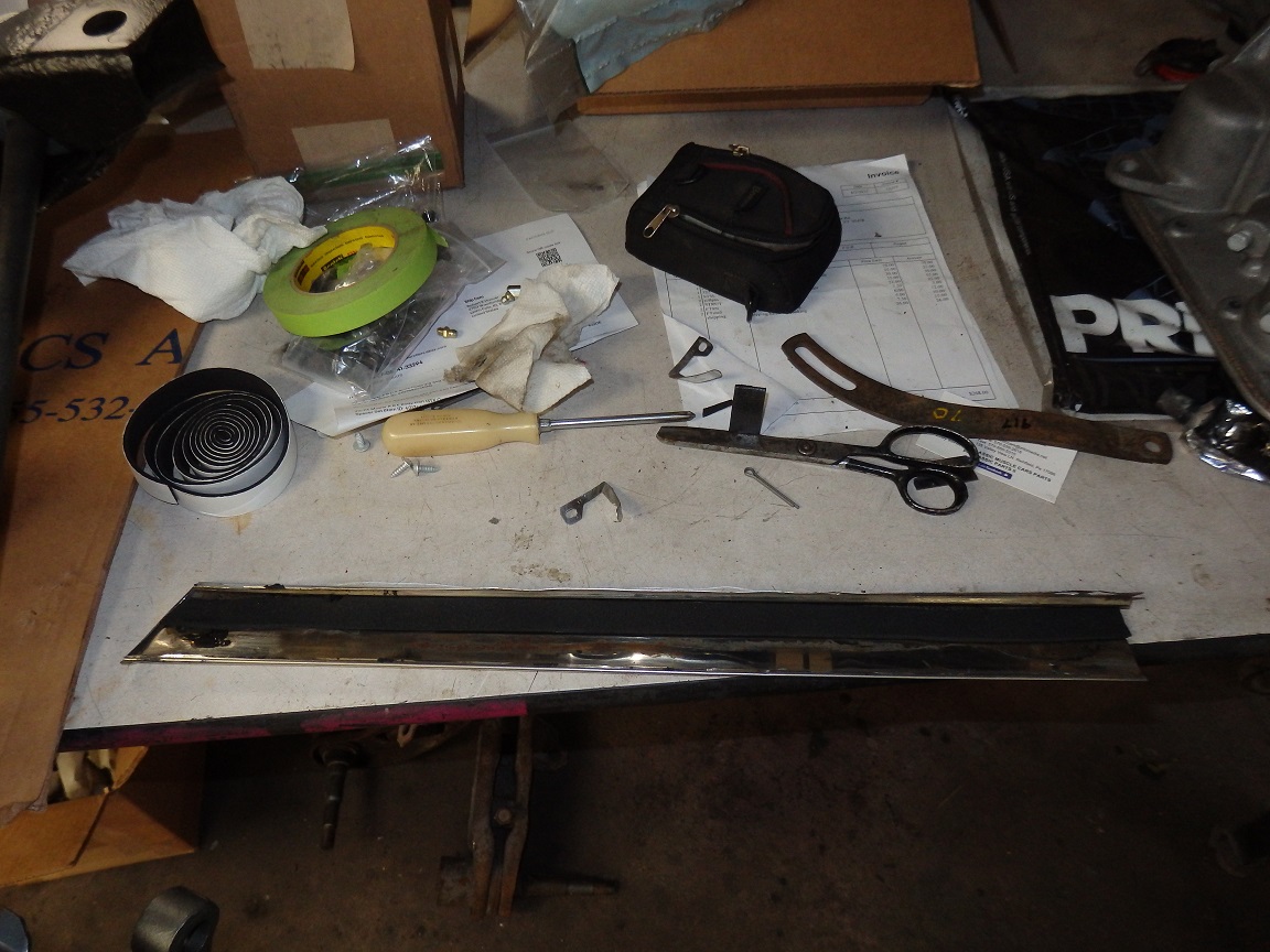 I sent the stainless steel trim out to be polished. The picture on the left is of it before I sent it out. On the right is a picture of the outer RH A-pillar moulding before installation. A strip of 1 inch foam seal goes on the inside before installation. Also in the picture are the fishhook shaped stainless steel pieces. These hold the end of the lower windshield mouldings in place across the top of the fenders. |