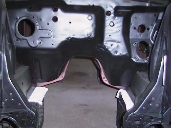 This picture was taken through the rear window opening. The firewall is ready for the dash to be installed.