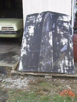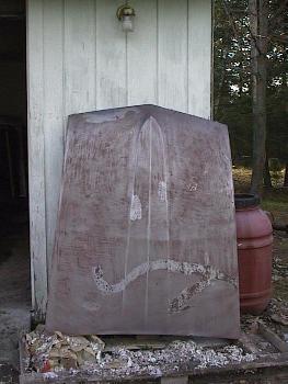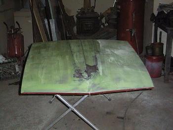 The top of the hood had a some small waves and dings. What I did was put a very thin coat of filler over the hood surface and hand sanded the hood lighty using a big board sander.