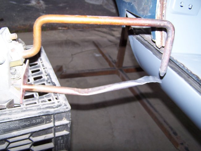 trouble of protecting this area with primer. Then with the tub flipped over I spot welded the top portion of the inner and outer rockers together. There are a significant amount of spot welds required to hold the rockers together. For this job I made a special lower tong for the spot welder using a 1/2" copper pipe that I hammered flat on one end. It made the job very easy, but the tong only survived long enough to do both sides. With the welds cleaned-up I primed the inside floors and rockers. The only thing left to do was to seam seal the seams and the interior will be ready for color. It should be noted that repairs up to this point are what one can typically expect to perform on any E-Type Jagaur restoration. This is mainly due to the car's construction. Many inner areas of the structure where unprotected and any protection tended to be burnt off during the lead loading process. The under carriage of the cars barely received any primer at all. They were just coated with a petroleum based undercoat. So if you are thinking of performing your own restoration on an E-Type keep in mind that it's a rare car that doesn't need this much repair. A word on protection: Epoxy primer can withstand a lot of heat before it burns so it's ideal for treating the panels. Wurth Body Wax will 'flow' instead of burning like rubberized undercoat. So it will still protect the inside of enclosed structural members. I've seen in flow out of the joints while welding. | ||