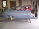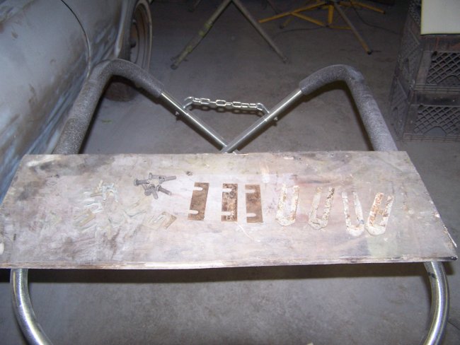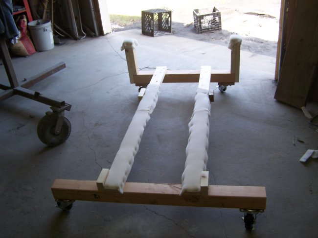 rockers and the seam between the rockers and the bonnet could be lead loaded. This can only be done with the body off the rotisserie. I built a cart to rest the shell on from a 2"X4"X8' and a couple