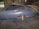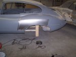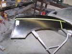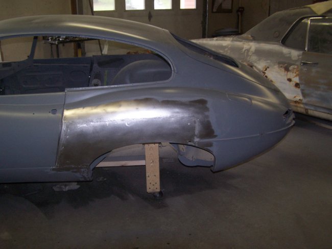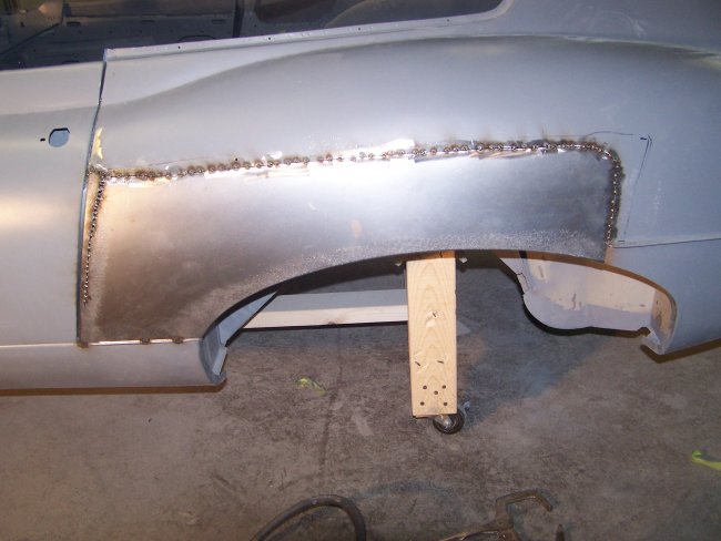 Since the joint at the rocker came out pretty even, I did not bother with lead on this side. I gave the whole panel a skim coat of Evercoat fiberglass filler, sanded it down and gave it a scratch