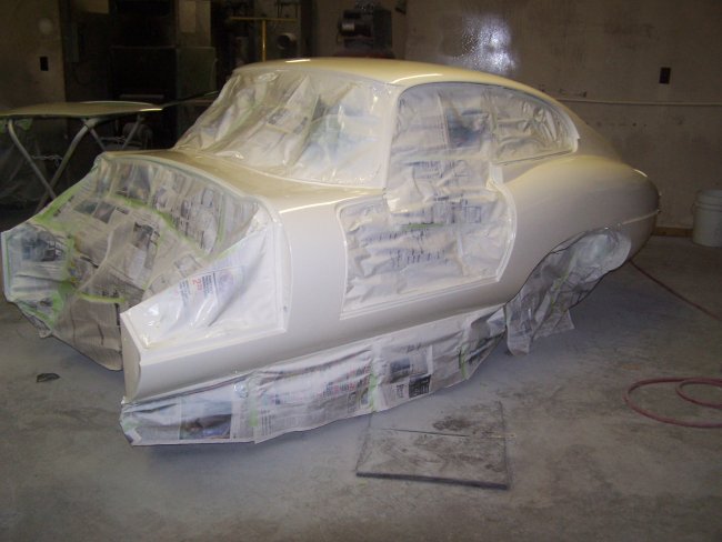 previously painted clean surfaces. It should be noted that the sanding juice (mixture of clear coat and water) when dried sticks to paint and is very hard to remove. I started by sanding the nibs (dust specs that produce bumps in the clear) down using 1200 grit paper on a foam sanding block and using soapy water. I actually had one run in the clear to fix on the bonnet (amazing there was only one in this curvy car) . This I took care of by blocking it down with 800 grit paper (wet) wrapped around a paint paddle. Being careful to only sand the run, I sanded it till it was almost gone. Then I took the rest of the run away using 1200 grit. I then sanded everything using 2000 grit Meguiars sandpaper wrapped around a semi-rigid foam sanding block. Sanding was done using warm soapy water. I wiped the panels dry with Bounce paper towels (because they are soft)as I went. The sanding was then repeated using 2500 grit Meguiars sandpaper. I probably have 7 hours into sanding the car by hand. At this point I normally start buffing the car starting with a high cutting 3M compound, but my brother suggested that I try the new 3M Trizact 3000P sanding disks on my orbital sander. He claims that it replaces the first buffing step and it makes the second buffing step easier. He gave me 2 disks which were plenty enough to do the entire car. They turned out to be pretty easy to use. You just wet the pad and lightly wet the panel using a spray bottle with soapy water as you go. You then sand the panel like you normally would. I found that a properly sanded panel will look kind of frosted, like etched glass, but will not show any of the sanding scratches made by the rougher grit sanding. The car was then buffed using 3M PerfectIt Polishing Pad Glaze 05996 using a Dewalt DW849 variable speed polisher with an orange buffing pad. This buffing step takes out a majority of the haze in the sanded clear coat. Buffing and polishing is a nerve-racking process. It is quite easy to burn through the paint if you stay too long in one area. In a split second you can burn off the paint along the edges if you don't follow the golden rule 'always roll the buffing pad off the panel and never into the panel'. This is because the pad will dig into the paint on the edges as it is compressed when it meets the edge of the panel. E-types are very difficult to buff. I found myself using wide masking tape to prevent buffing into adjacent edges and seams. A final polishing step was required to remove the light scratches. I first washed the car down soapy water to remove the residual buffing compound. Once dried, I polished the car using Meguiars Show Car Glaze 7 (polish) using a gray buffing pad on the Dewalt DW849. With the polishing completed one more wash was performed and the whole car was unmasked. | ||