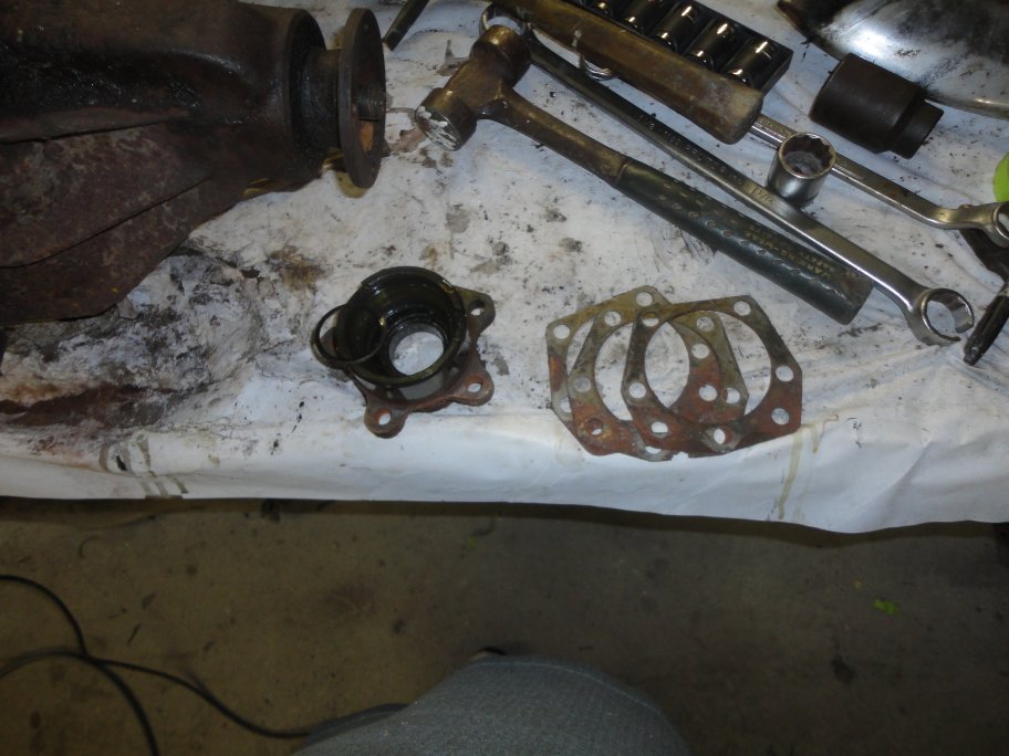 12) Here the output shaft housing and shims are removed from the diff housing. The shims on earlier cars like this one are a little bigger and have 2 extra holes