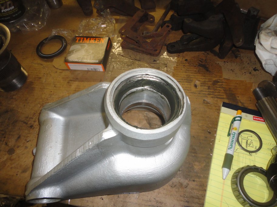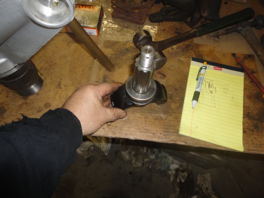 I used a large socket and a hammer to drive the inner bearing onto the end of the hub assembly (though I could have used a driveshaft yoke and drawn it in). I drove it on enough to produce roughly 0.020" worth of bearing float. (too little and I would have had to press the bearings back out and start over). It should be noted the end of the inner hub is actually too short to go all the way through the bearing. It is in fact roughly 0.150" too short.