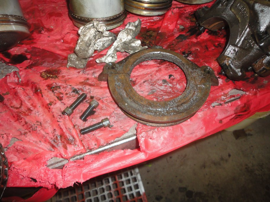 33) The lower rear main bearing cap must be removed to pull the crank. The cap is attached with only 2 socket head screws, which can't