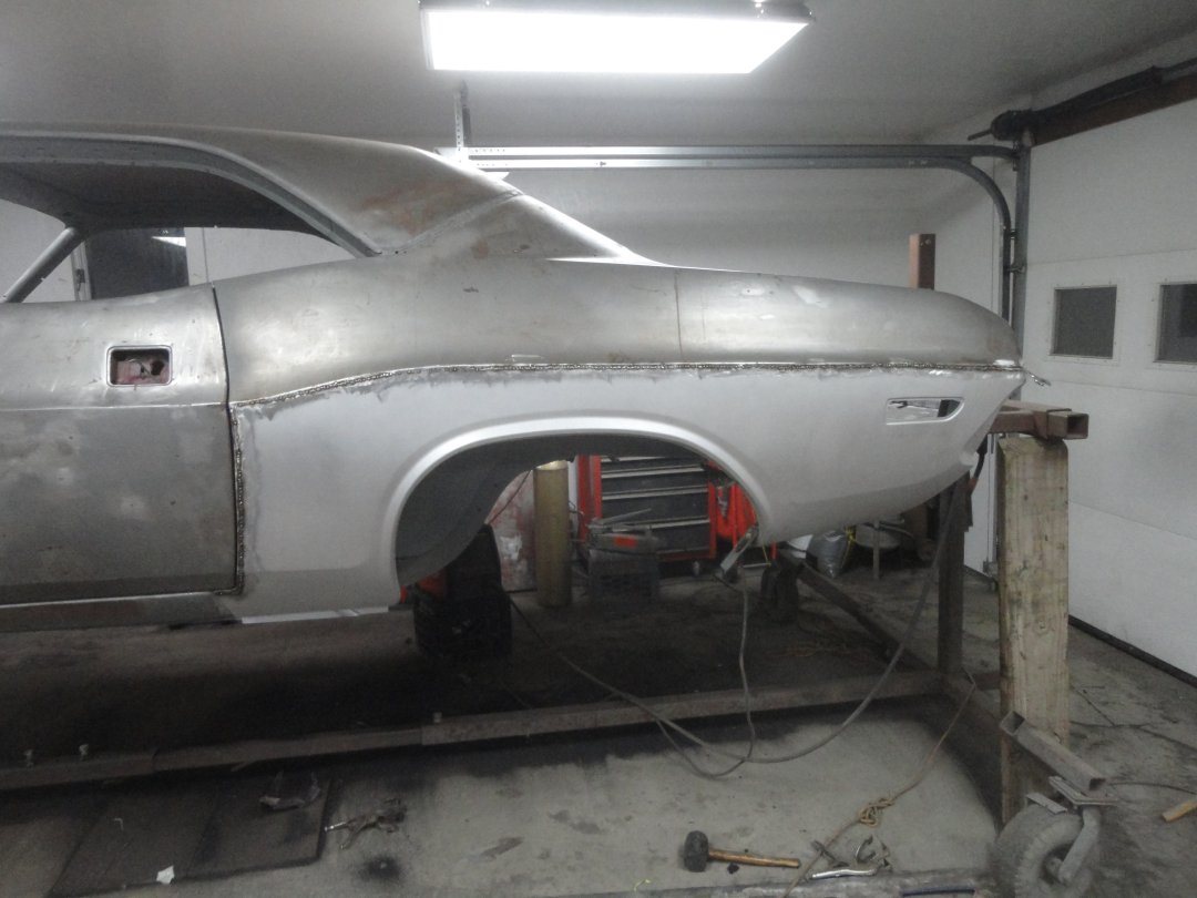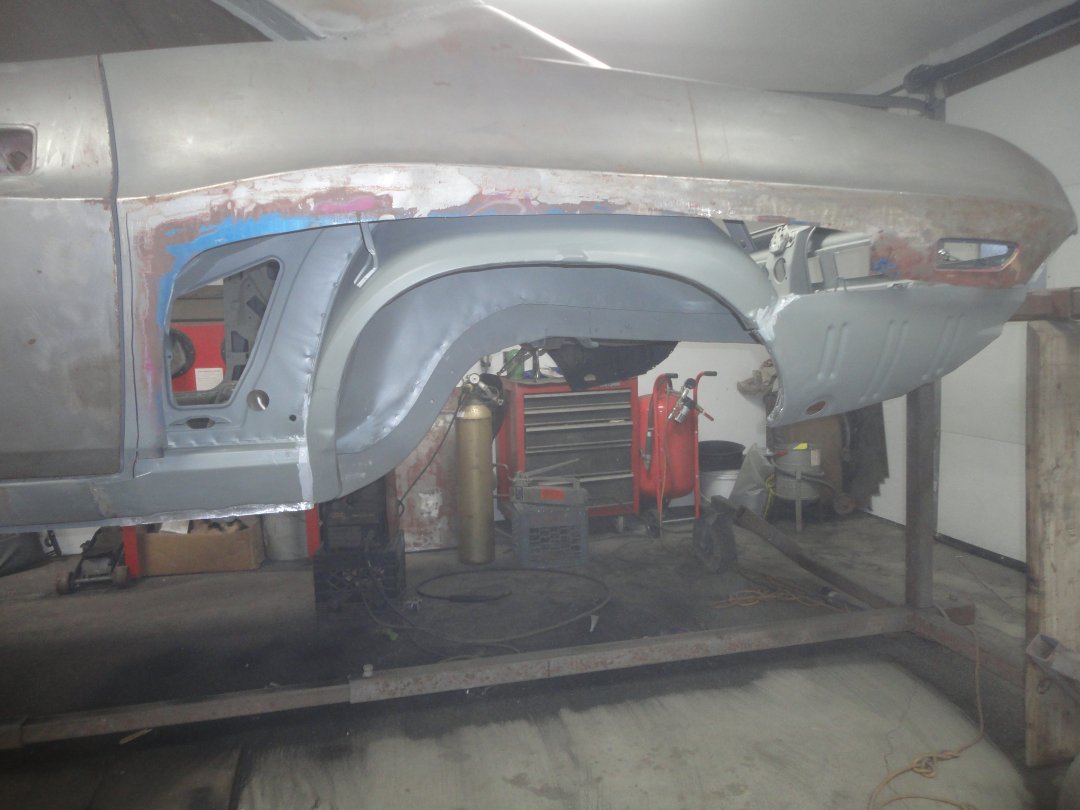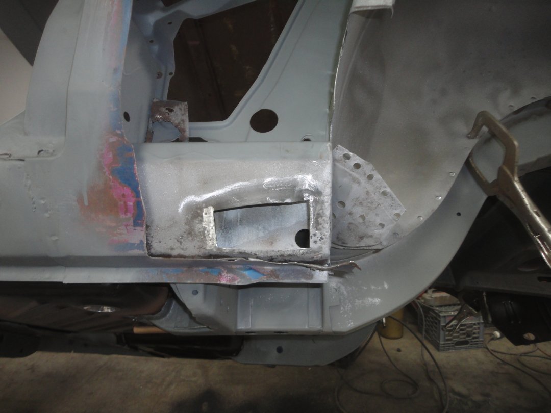 78) For the front patch of the wheel well, I used a section of a new repo panel. Here it is welded in place just before the