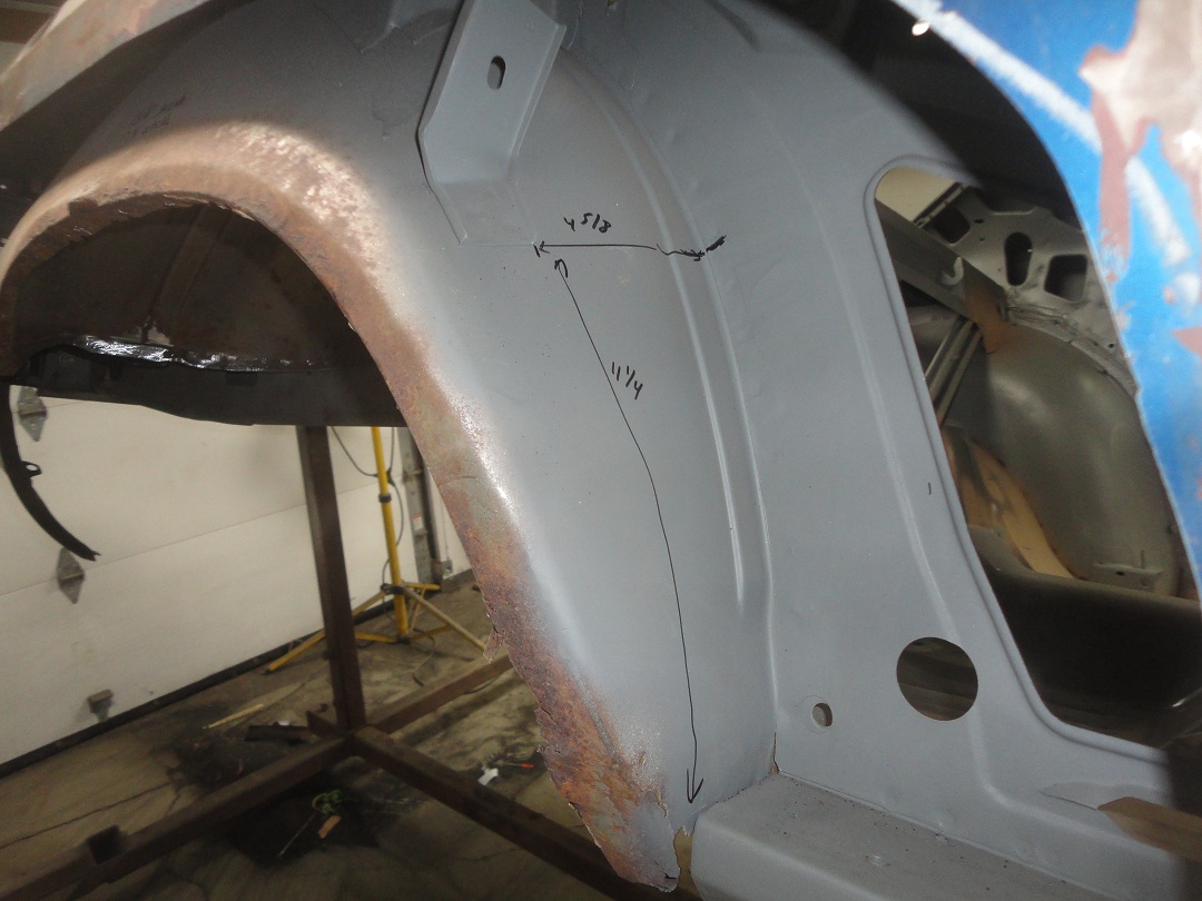 104) Here is a picture of my new Dynacorn rear quarter. The 4 holes for the gas filler were a bit undersized (which I corrected), but