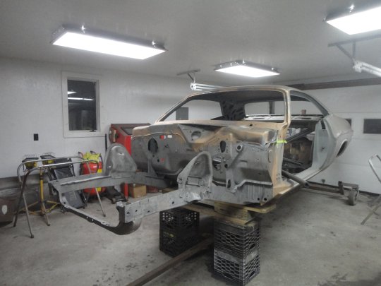 136) The next thing to do was to sandblast the entire front end. I had to do this indoors so I built a makeshift booth around it with plastic and PVC pipe. Here it is after blasting with the booth removed and the mess cleaned up.
