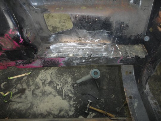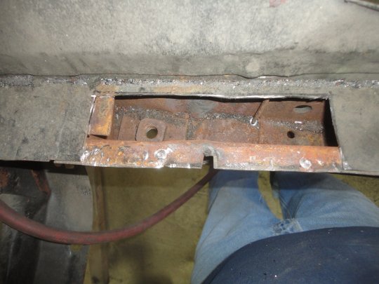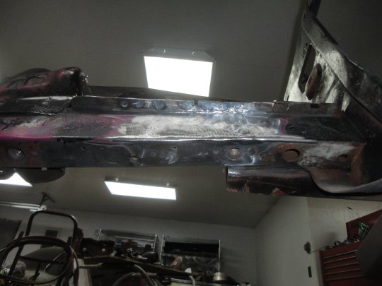 130) Here's a shot from the bottom. You can see that the notches don't quite line up. This is the way it originally came from the factory. You can also see the pinch welds I made to dress up the seam. As with the right side, no filler will be required to pretty up the repair.