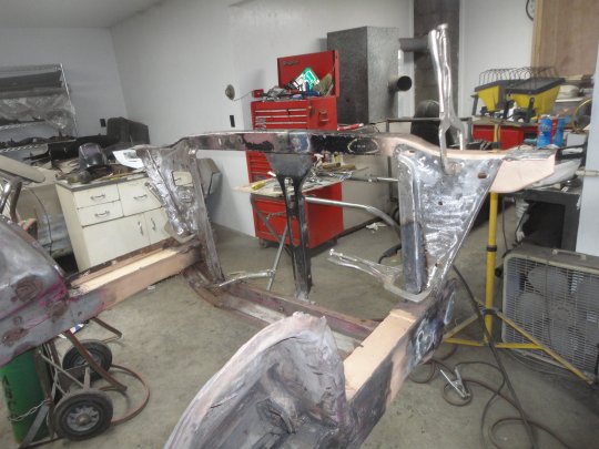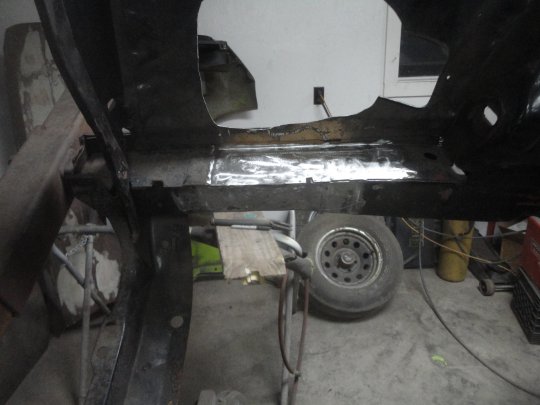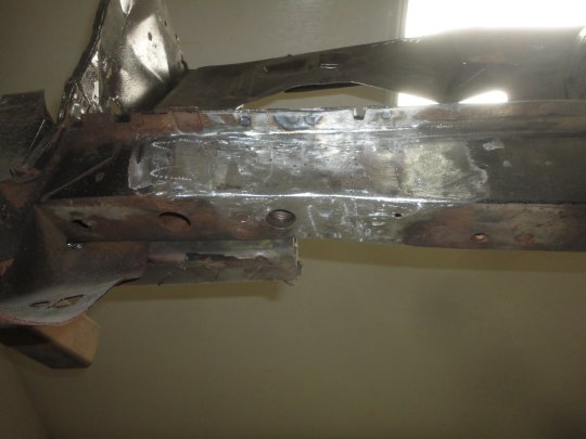 131) I sprayed some weldthru primer on the repairs to protect them from corrosion while I worked on the radiator support. I should mention that I test fitted the K-frame to ensure that things still lined up after the frame rail repair. I also compared measurements of the frame and compared them to the measurements in the service manual. Things still were in alignment. Wheh!