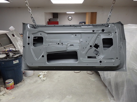 172) Here is the door ready for primer. It looks like there is a lot of filler on the door, but it is very thin. Most of the imperfections could have been taken care of in the highbuild primer stage, but I like to catch any series imperfection at this stage.