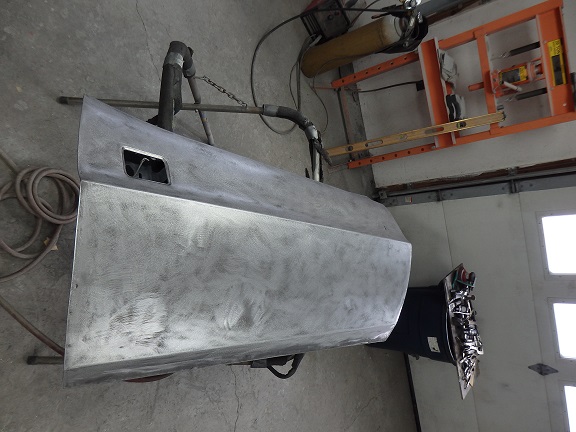 170) First the face of the door was ground flat along the perimeter with a disk sander with 40 grit disks. This takes out the majority of the imperfections cuased by hammer and dollying the skin in place.